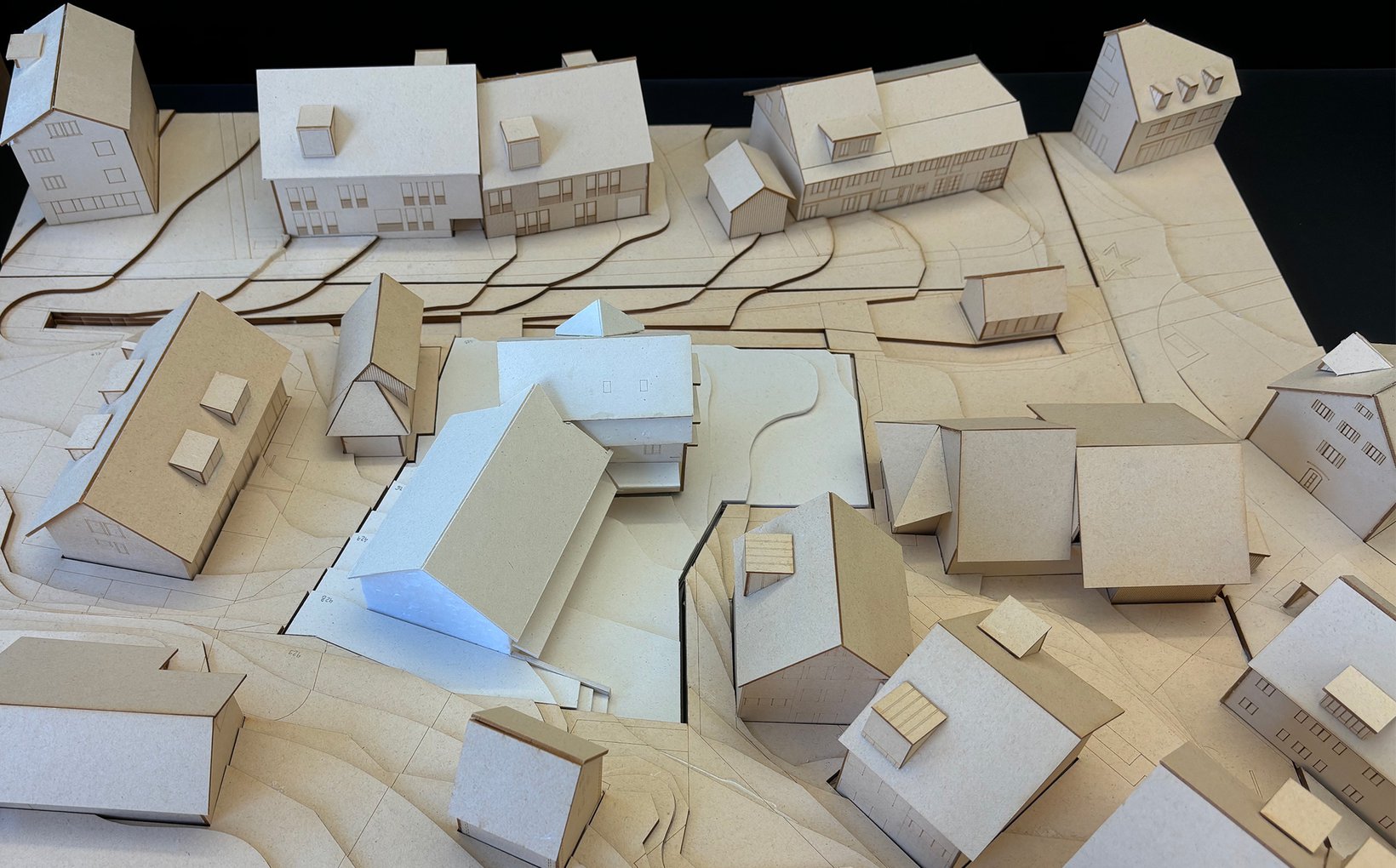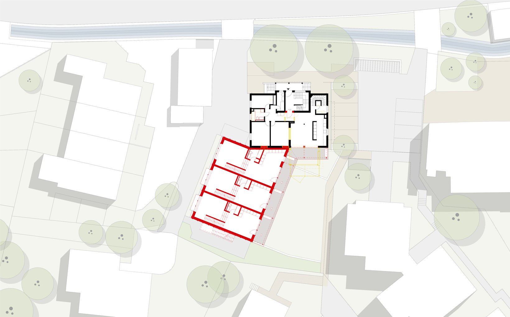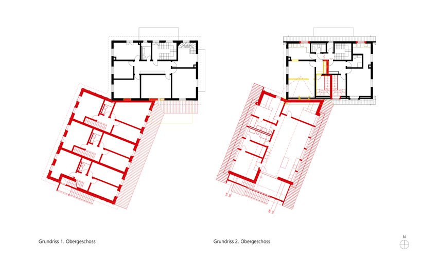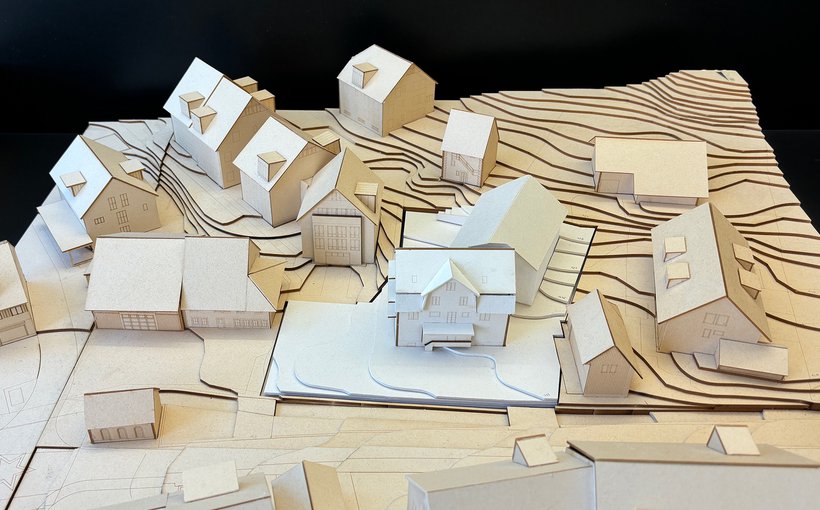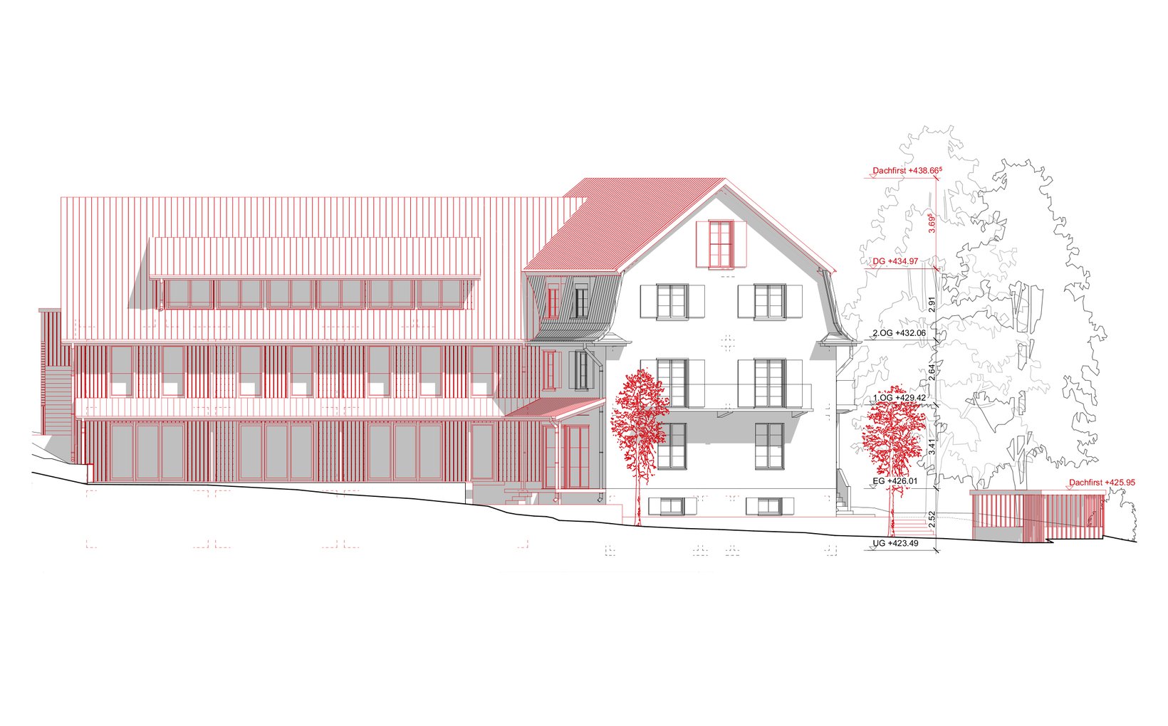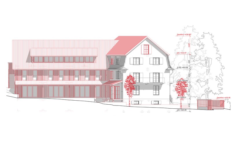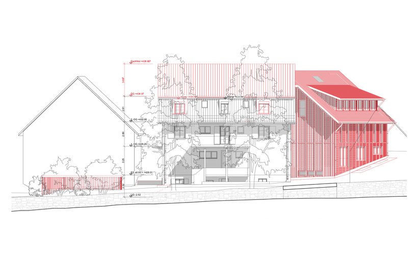 Die Liegenschaft befindet sich im Zentrum des alten Dorfkerns von Spreitenbach. Das Wohn- und Schulhaus aus dem Jahr 1940 bildete zusammen mit dem hinteren Schopf das heutige Ensemble. Mit dem Ziel einer qualitativen Verdichtung schlägt das Projekt vor, das Wohn- und Schulgebäude zu erhalten und umzubauen und den Schopf durch einen Anbau zu ersetzen. Der neue Anbau stärkt dieses bestehende Gebäude in Bezug auf die lokale Architektur. Der Anbau ist in seiner Größe (Holzbauweise, Höhe, Volumen) zurückhaltend und lässt das bestehende Gebäude als Hauptstruktur erhalten. Das Ensemble aus Hauptgebäude und Anbau schafft einen klar definierten Außenraum, wo sich früher der Hofgarten befand. Dieser Außenraum ist ein Innenhof, der einen idealen Freiraum vor dem denkmalgeschützten Getreidespeicher bildet.