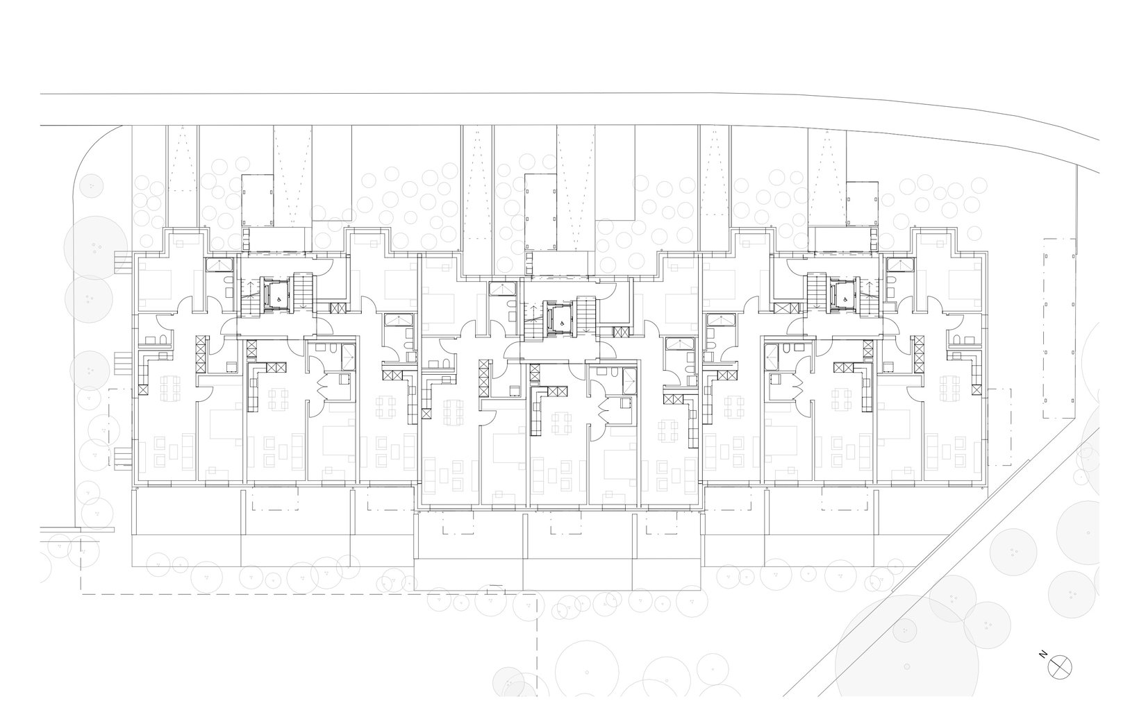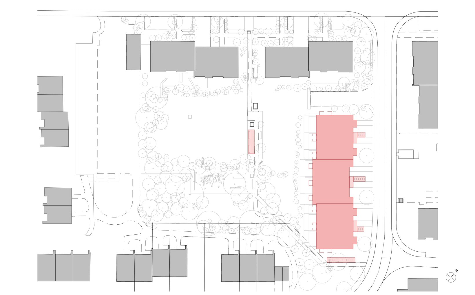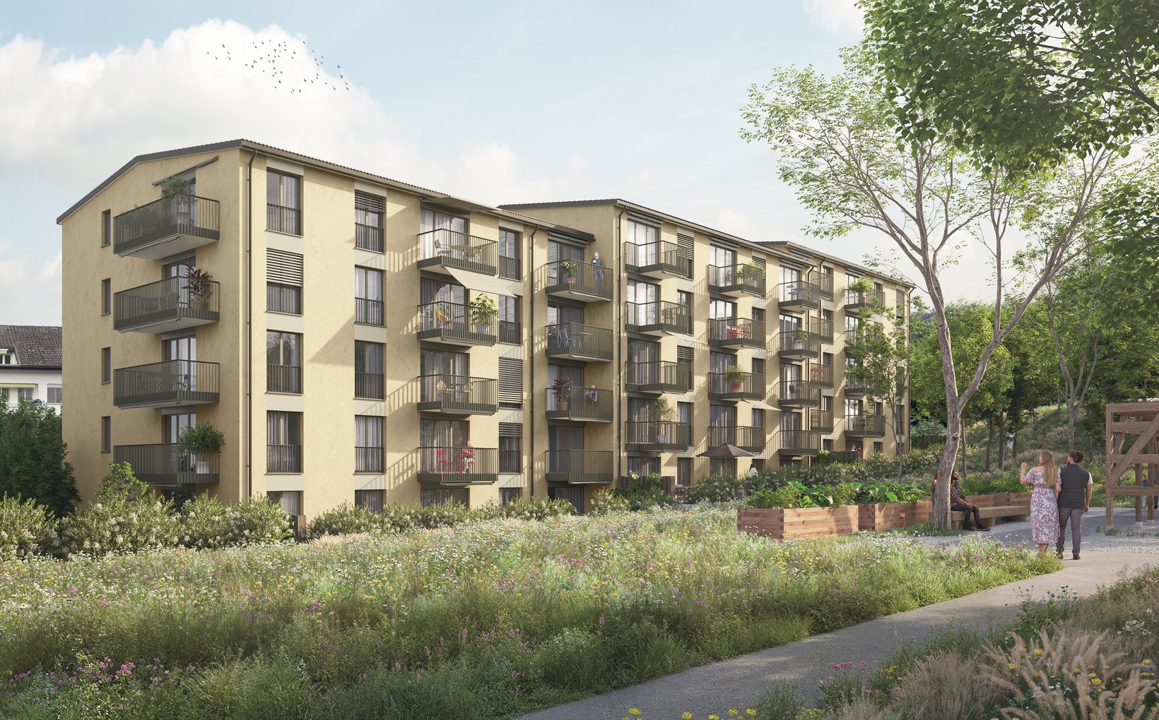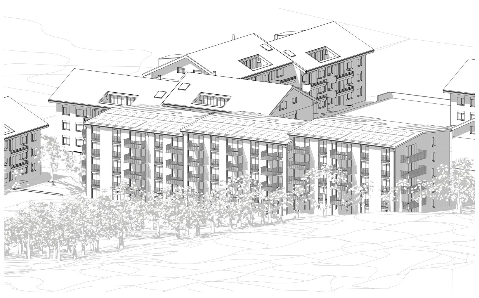 Der Ersatzneubau wird auf drei gleich grosse Baukörper aufgeteilt, die sich entlang der Sagenhofstrasse ausrichten. Das in der Höhe und Tiefe gegliederte Volumen wird durch eine klare, einfache Wahl der Materialien und Farben als Gesamterscheinung gestärkt. Eine Komposition aus grobkörnigem Putz an der Hauptfassade sowie feinkörnigeren, helleren Flächen der vorspringenden Gebäudeteile und des Sockels bilden die solide Basis. Warme erdige Farbtöne stehen in Beziehung zu den Nachbarshäusern und integrieren sich in die grüne Umgebung. Die weiteren Elemente wie Fenster, Geländer, Sonnenschutz kontrastieren im warmen Grau. Die dunkle Dacheindeckung mit der PV-Anlage nimmt sich dezent zurück. Insgesamt entstehen 45 neue Kleinwohnungen. Der Bestand hat ausschliesslich Grosswohnungen. Der neu Wohnungsmix schafft ein breiteres Wohnspektrum und ermöglicht den best. Mietern weiter im Areal wohnhaft zu bleiben, auch wenn sich die Lebensumstände ändern und weniger Wohnraum benötigt wird.