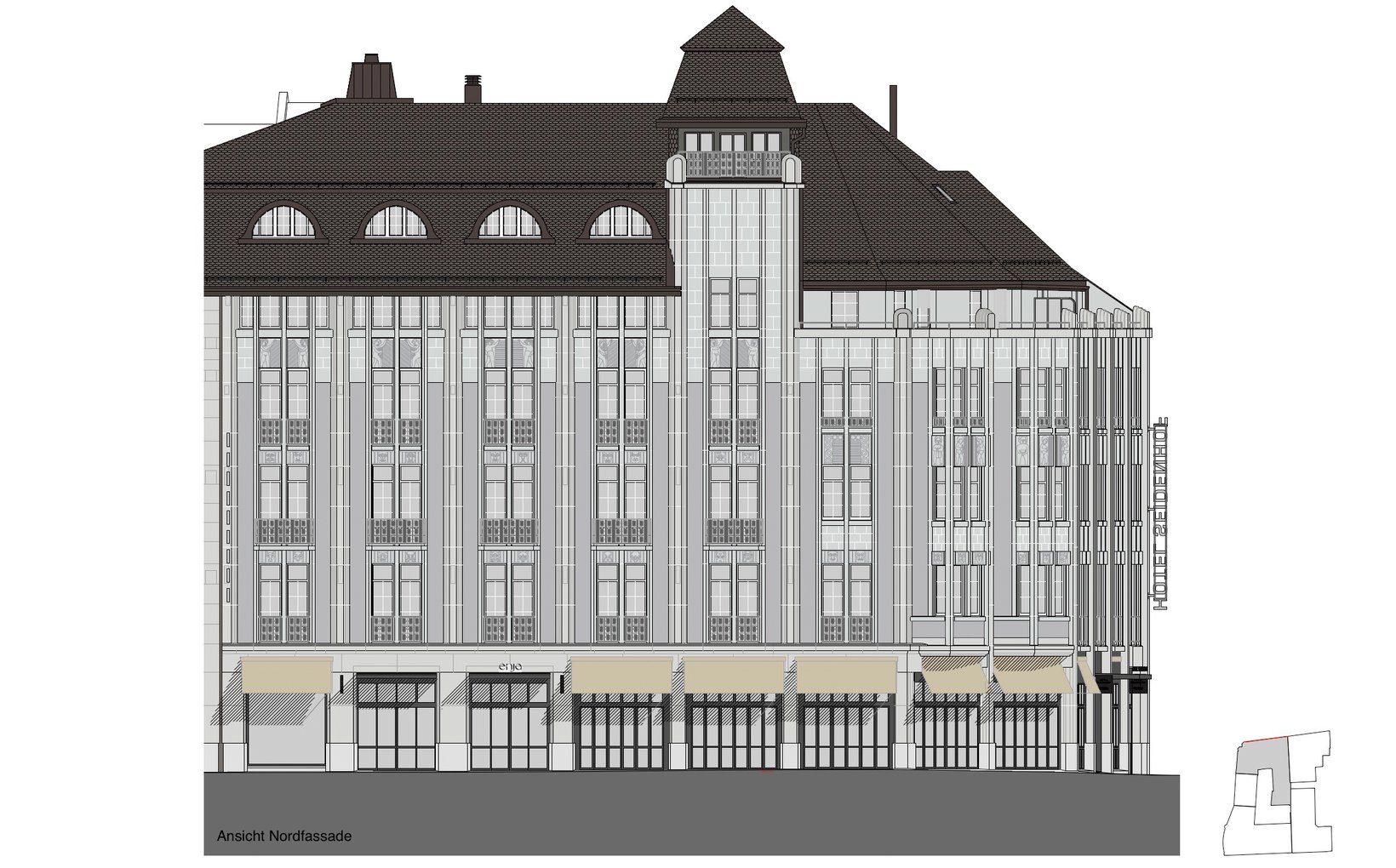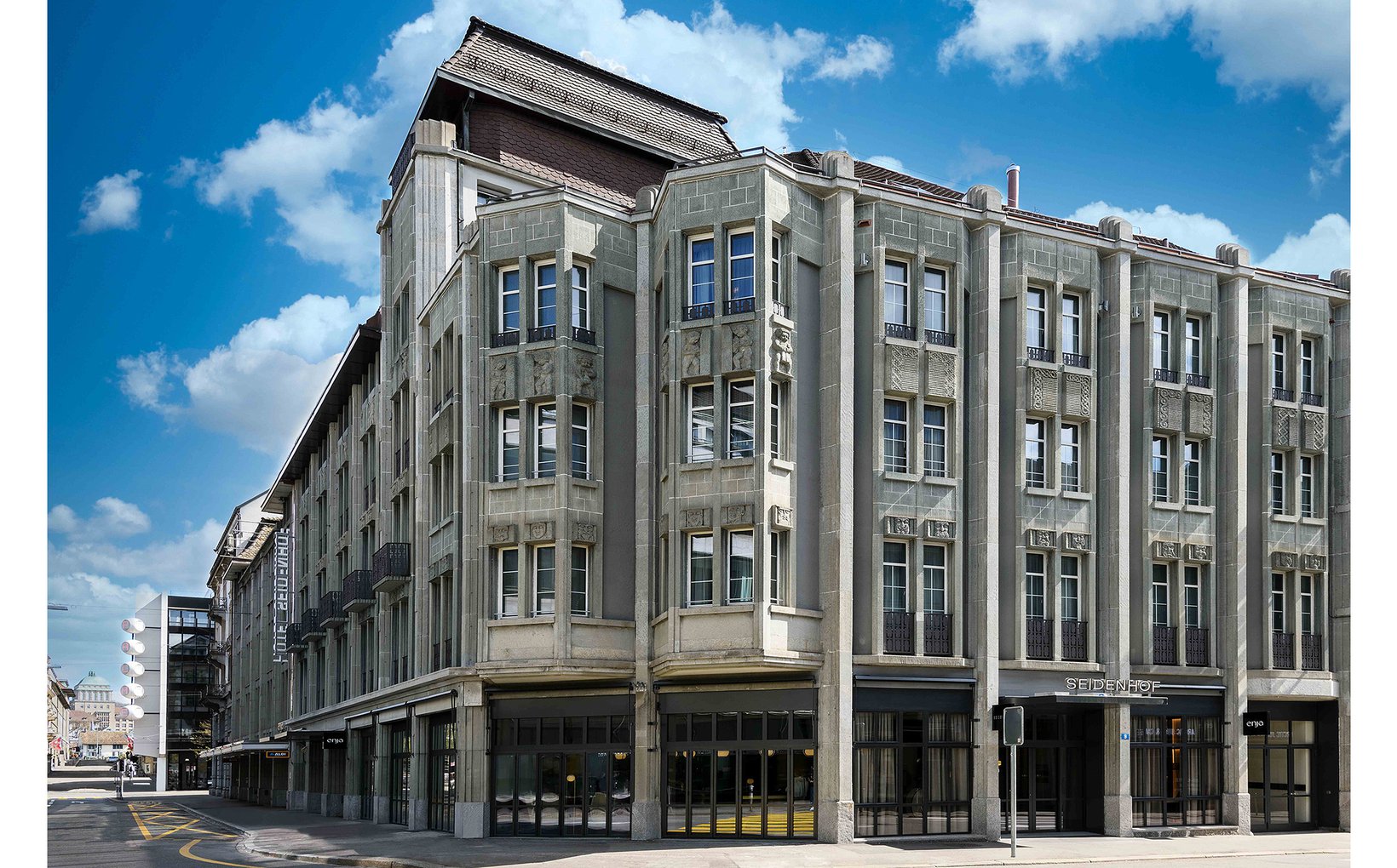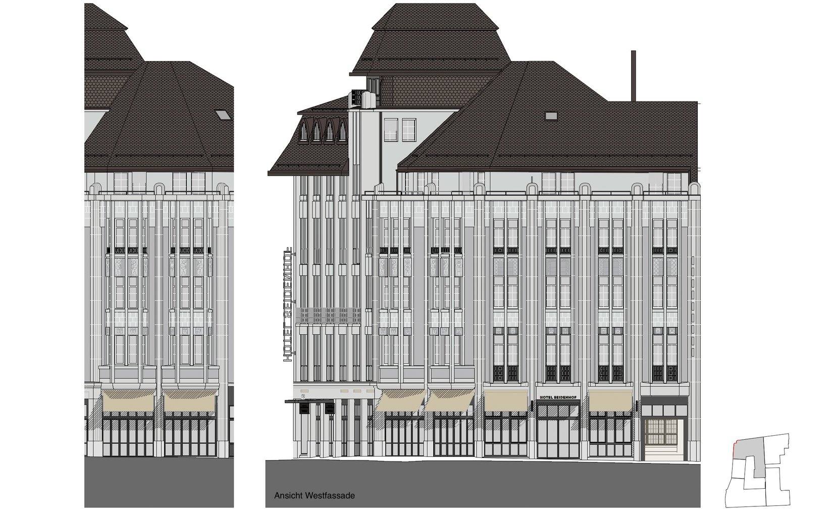 Das Hotel Seidenhof an der Sihlstrasse wurde 1911 erbaut. Das Gebäude wurde inzwischen mehrmals umgebaut und soll nun wieder den aktuellen Anforderungen eines 4*-Hotels angepasst werden. Das Volumen kann nicht vergrössert werden, neu finden 80 Zimmer Platz. Im Erdgeschoss befinden sich neben Lobby und Restaurant auch noch Ladenflächen.