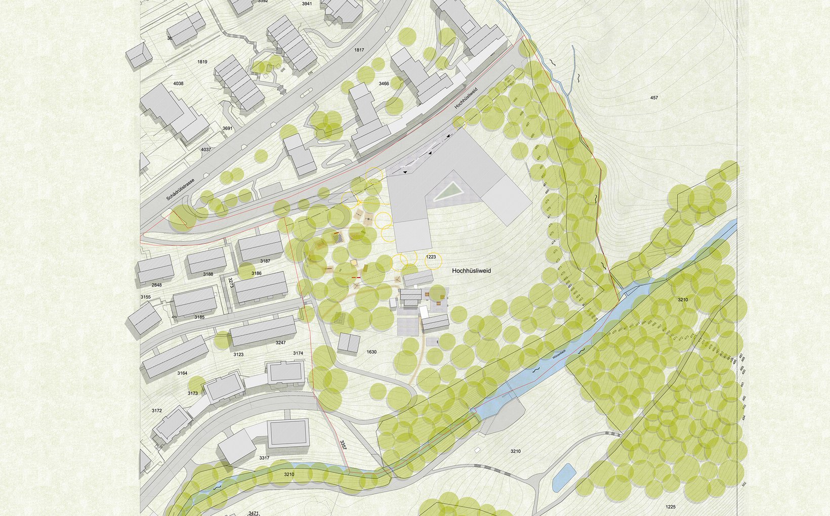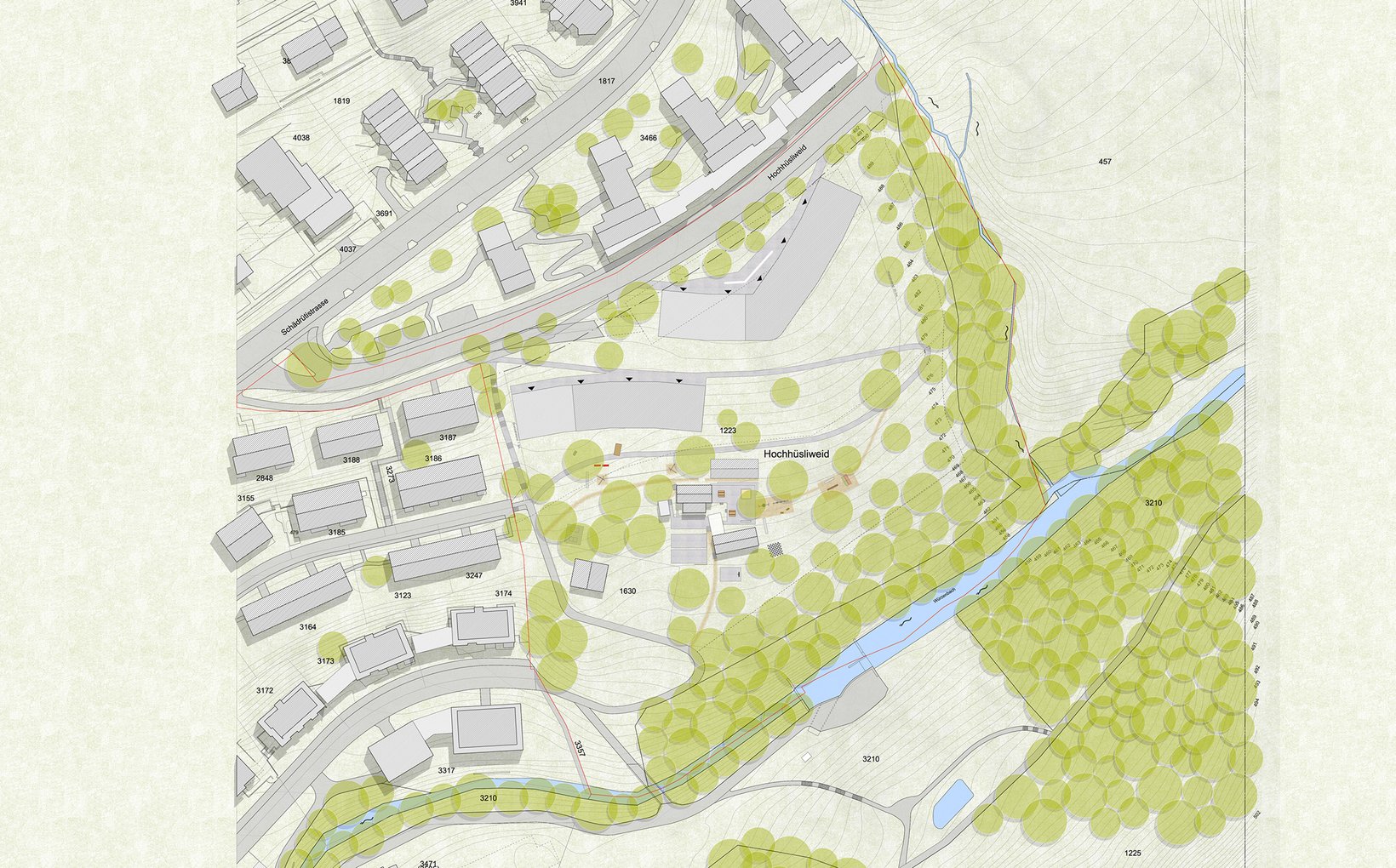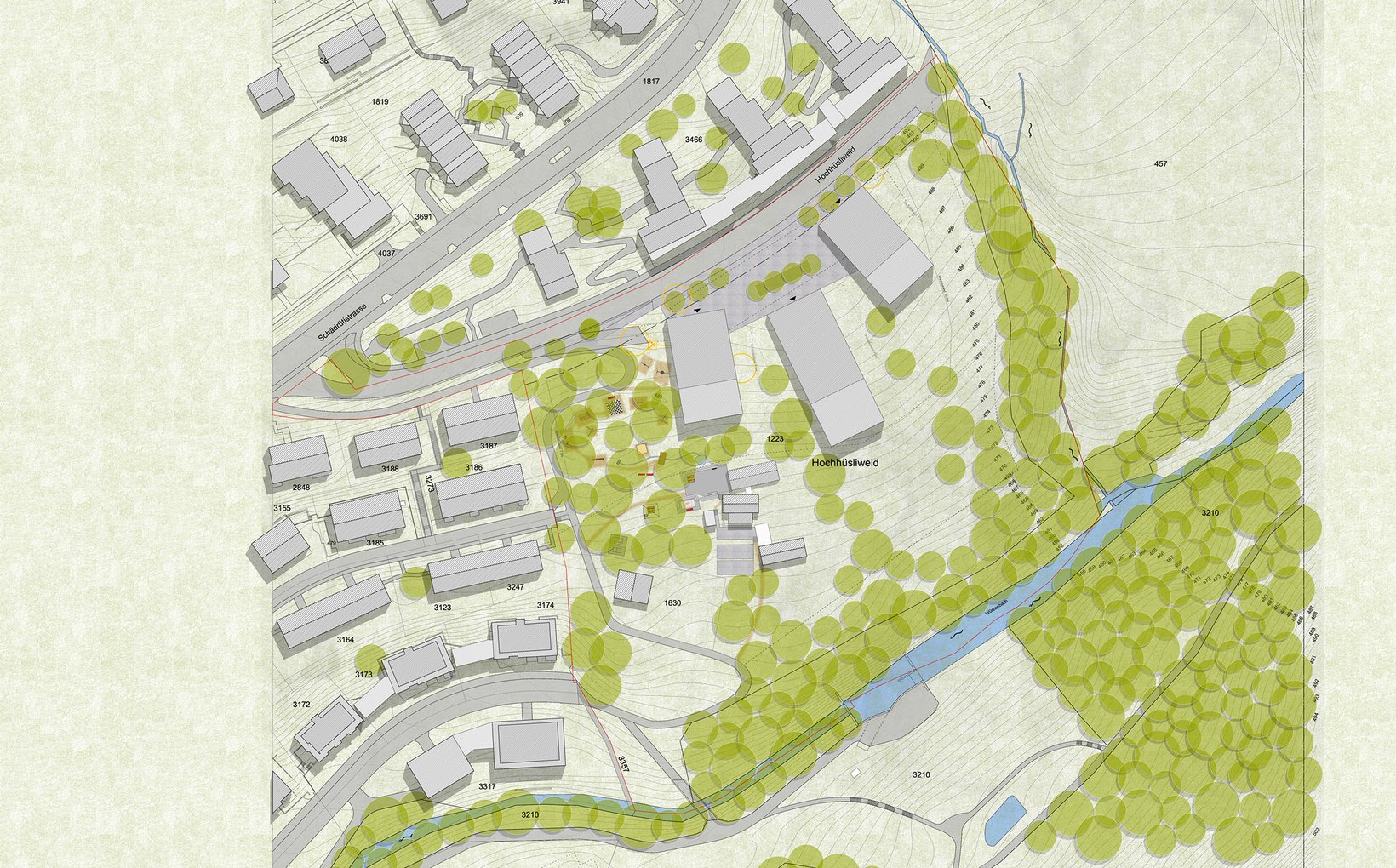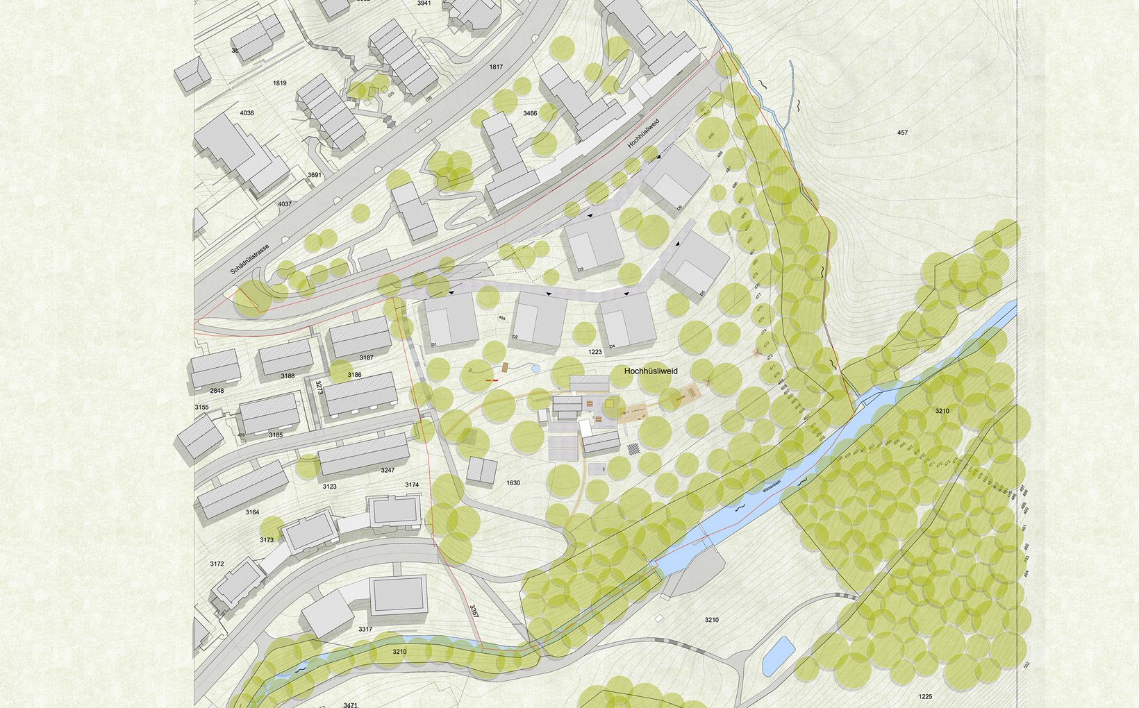 Auf dem Areal der Hochhüsliweid wurde in Varianten geprüft mit welcher Bebauung eine qualitative gute Situation bei der vorgegebenen Dichte erreicht werden kann. Diese bilden die Grundlage für die Abgabe im Baurecht. Das Konzept der Fortführung der Bebauungstypologie oberhalb bzw. westlich des Areals führte zu den grundsätzlich unterschiedlichen Bebauungstypen parallel und quer zum Hang. Der bestehende Grünbereich mit Spielplatz wird bei den Ansätzen parallel zum Hang in den unteren Bereich ausserhalb der Wohnzone verschoben.