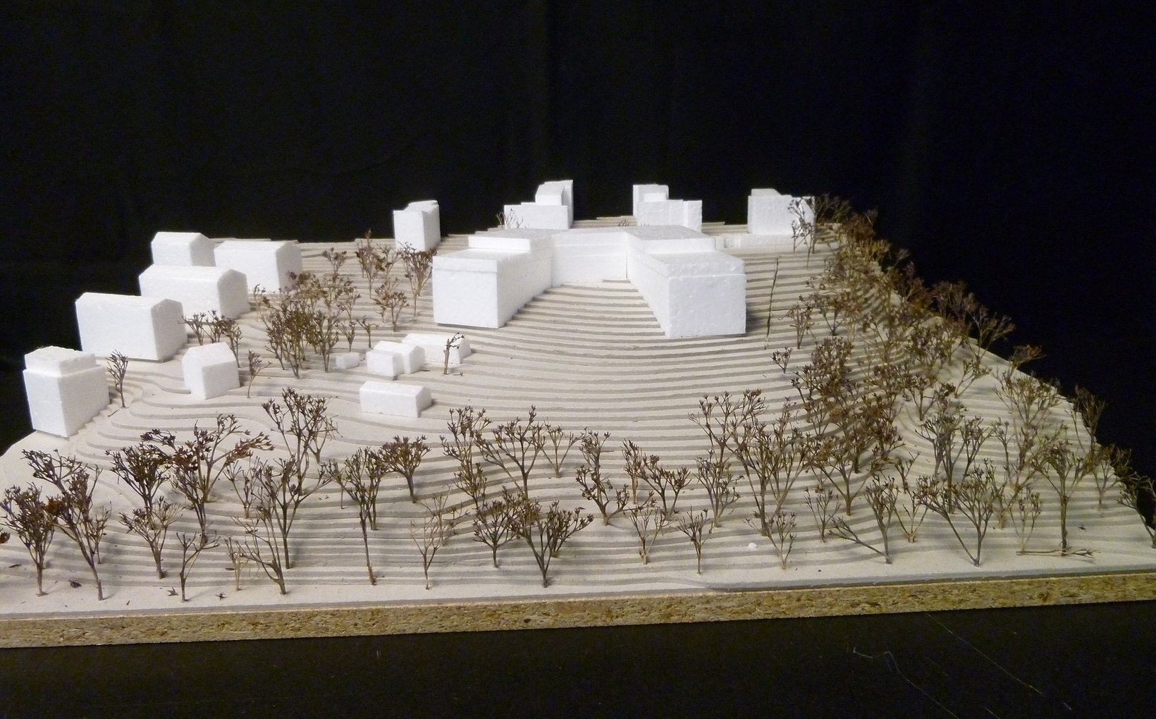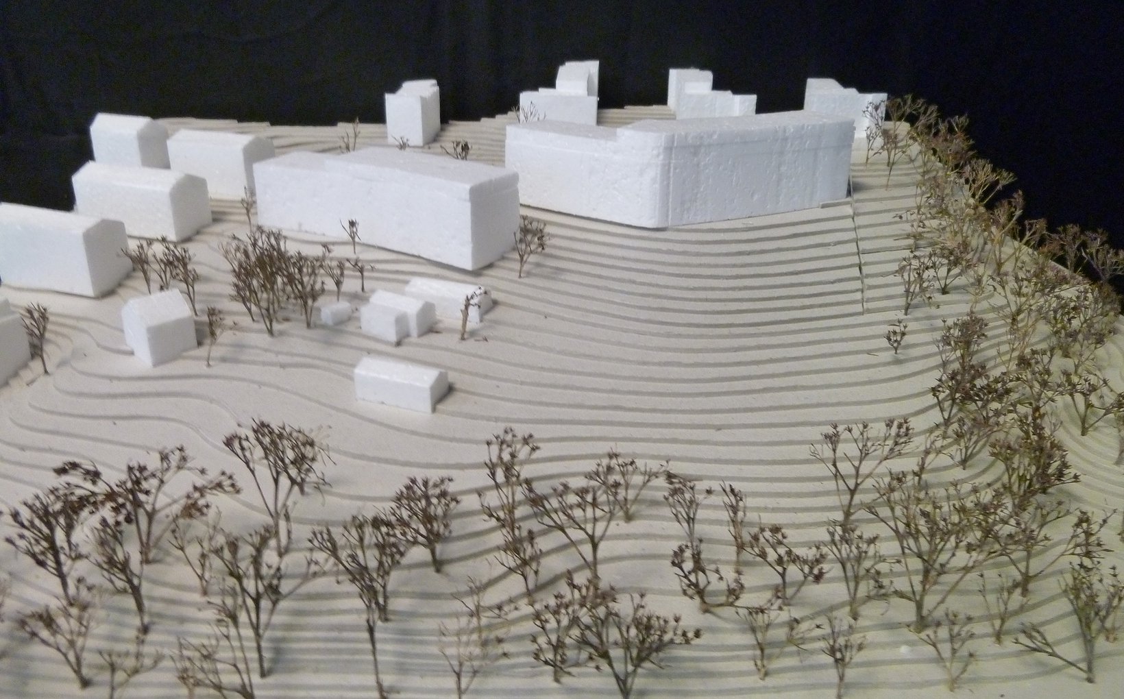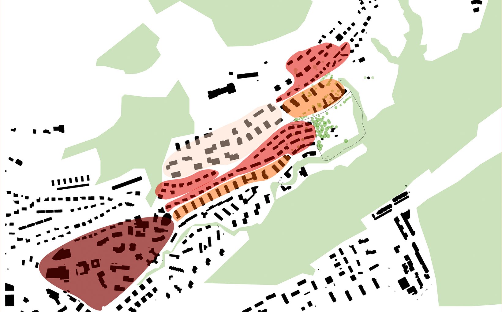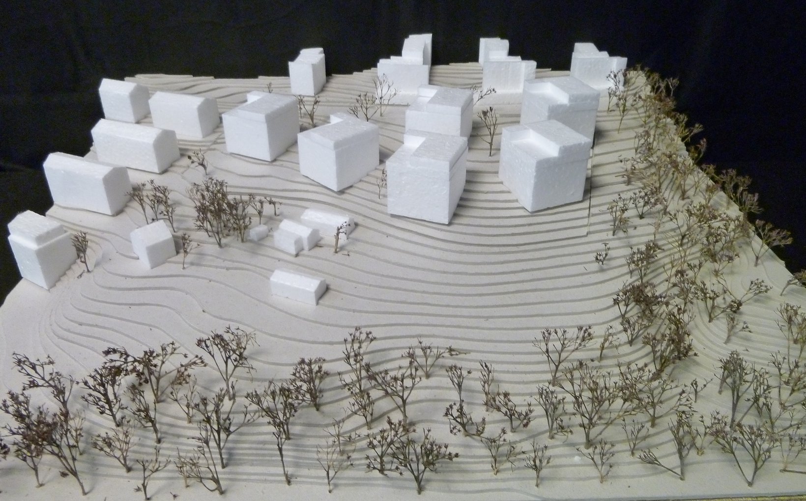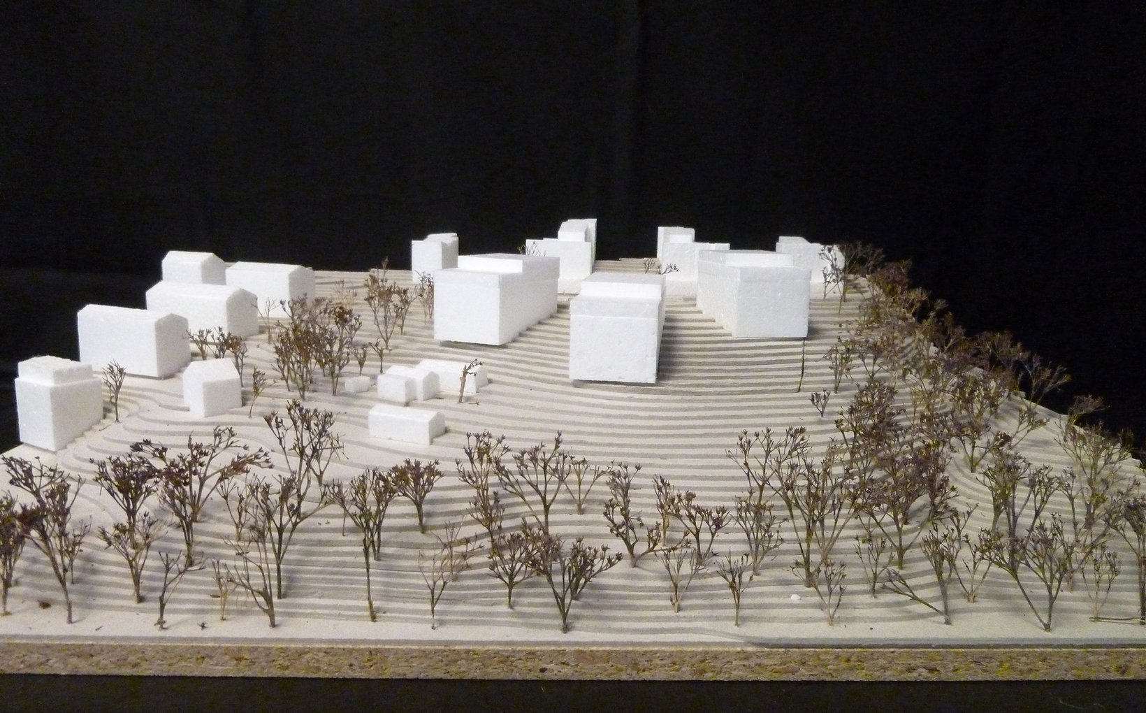 Auf dem Areal der Hochhüsliweid wurde in Varianten geprüft mit welcher Bebauung eine qualitative gute Situation bei der vorgegebenen Dichte erreicht werden kann. Diese bilden die Grundlage für die Abgabe im Baurecht. Das Konzept der Fortführung der Bebauungstypologie oberhalb bzw. westlich des Areals führte zu den grundsätzlich unterschiedlichen Bebauungstypen parallel und quer zum Hang. Der bestehende Grünbereich mit Spielplatz wird bei den Ansätzen parallel zum Hang in den unteren Bereich ausserhalb der Wohnzone verschoben.