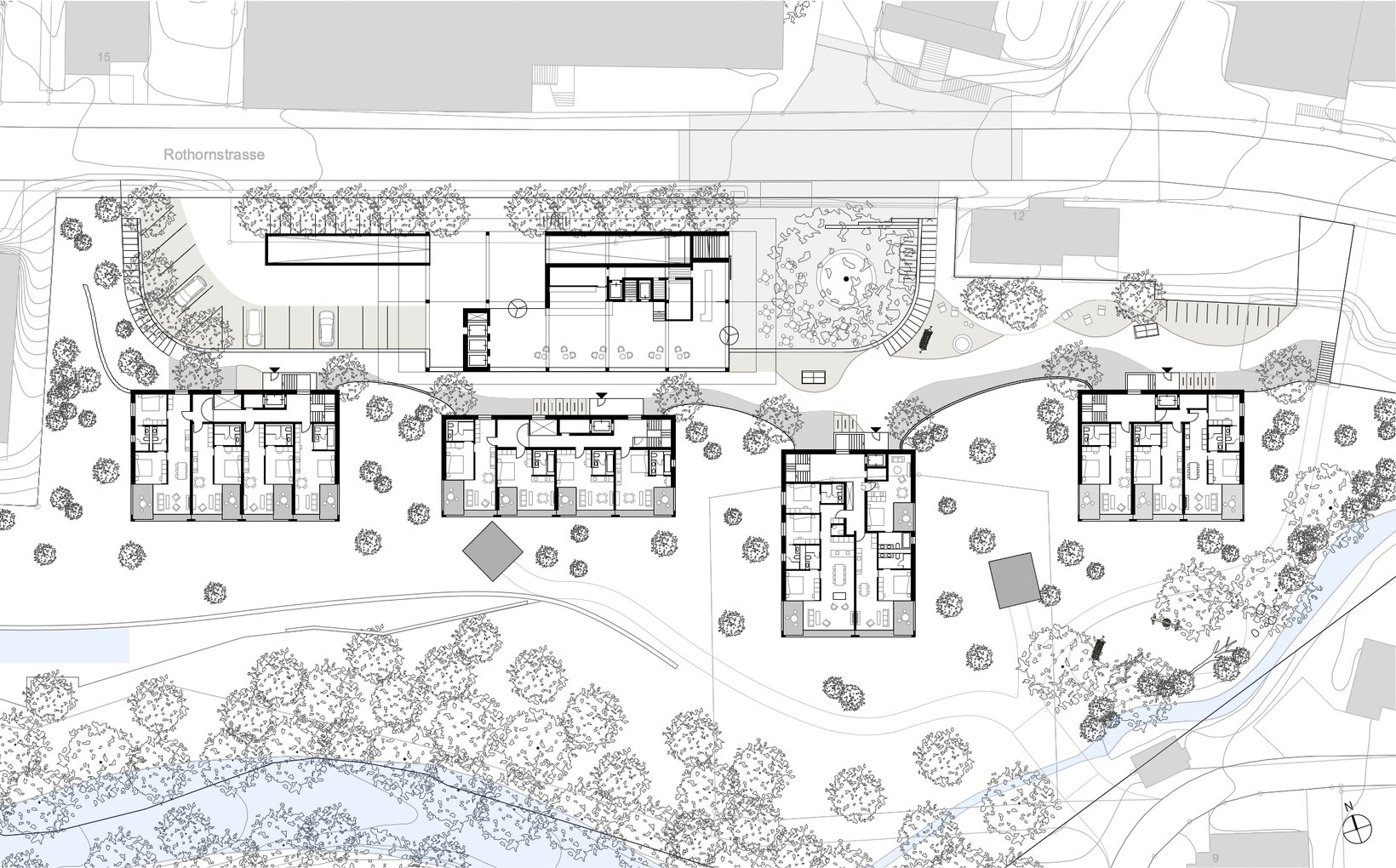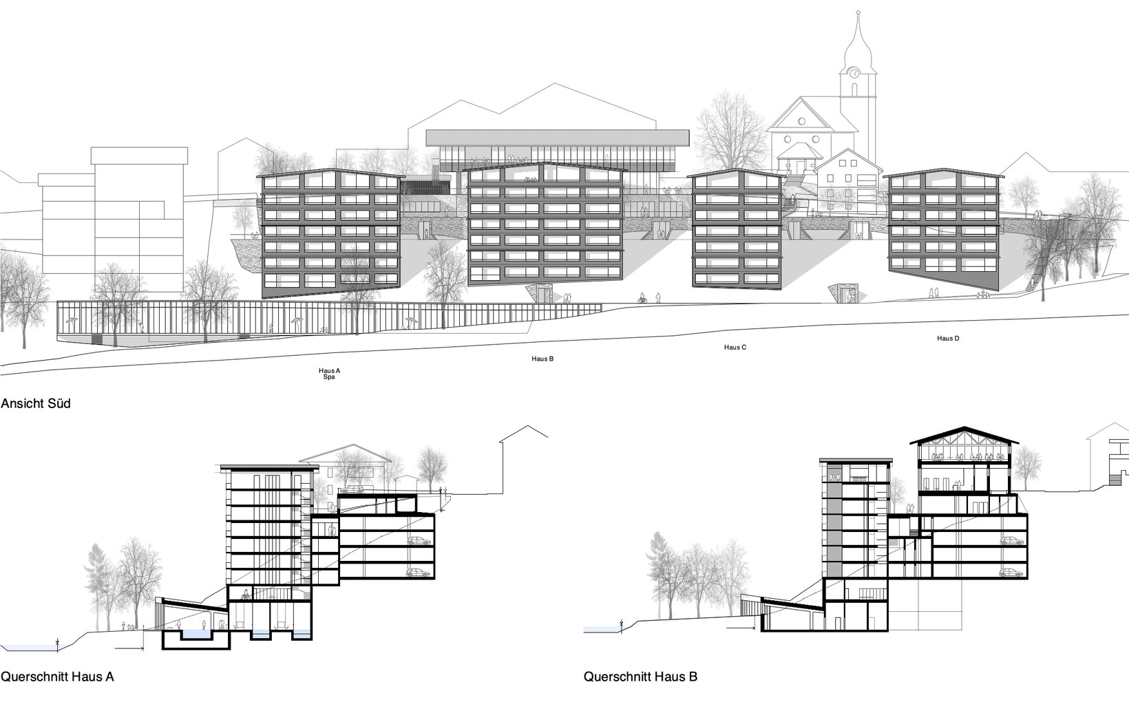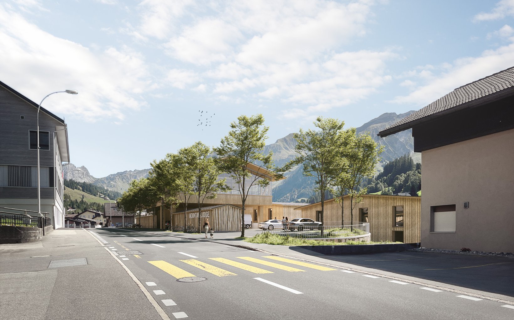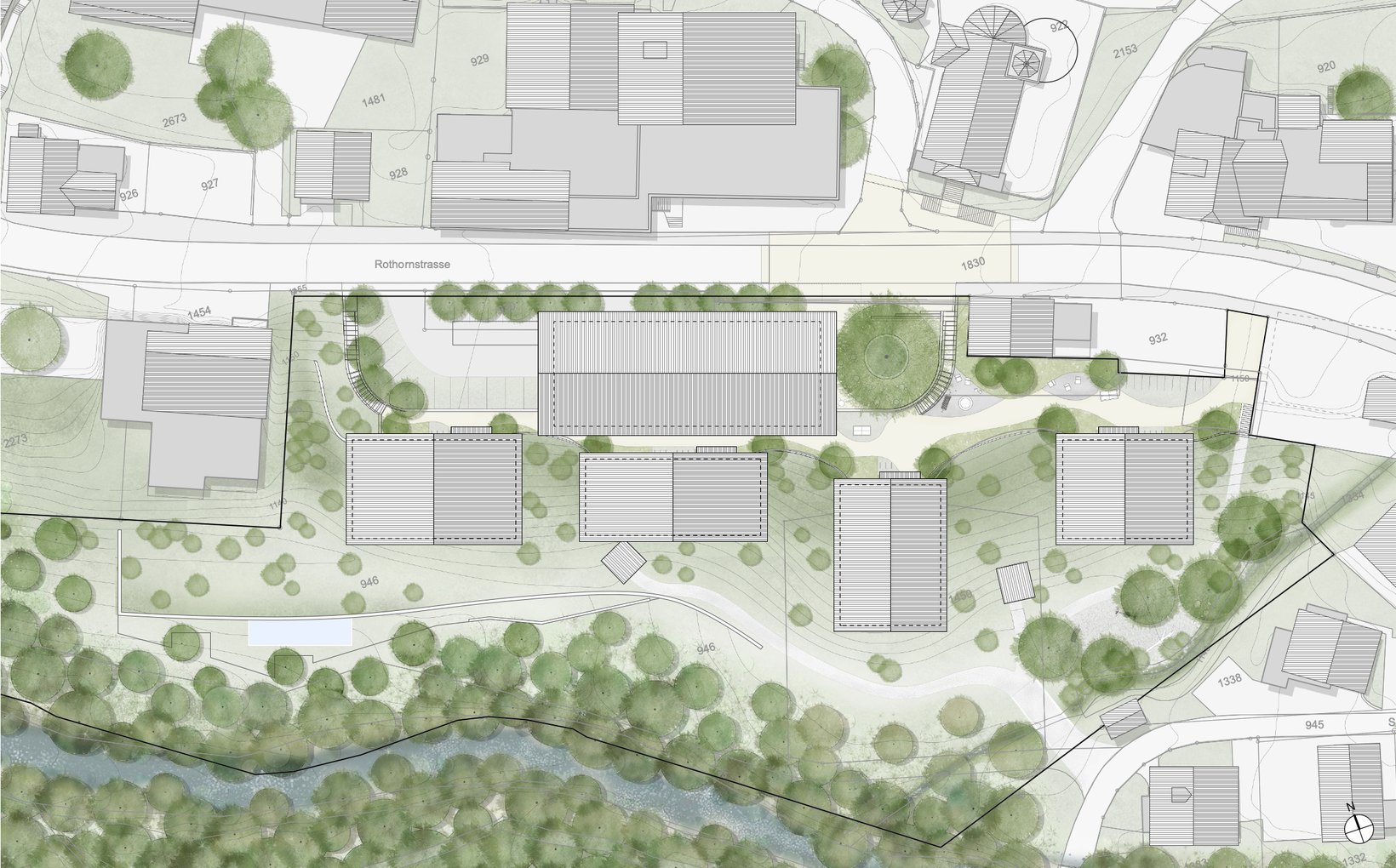 Das Projekt sieht ein Ensemble von fünf Einzelbauten vor, deren lockere und durchlässige Setzung Bezug nimmt zur Bebauung am Ort. Die vier Wohnhäuser stehen markant im Wiesenhang. Der Hang steigt kontinuierlich von der Waldemme zur Terrasse des Dorfweges hoch. Oberhalb des Dorfweges liegt die Esplanade an der Rothornstrasse, wo grosszügige Vorplätze den Besucher der Mountain-Lodge in das Empfangsgebäude führen. Darüber thront der grosse Raum des Restaurants mit einem 270° Panorama. Ganz unten, am Fuss des Wiesenhanges schmiegt sich der kaum wahrnehmbarer Gebäudekörper des Spa an den Waldrand.