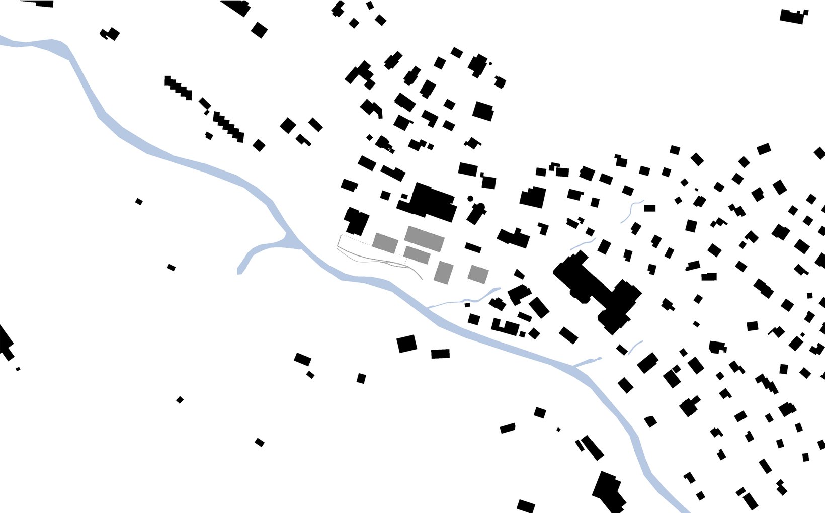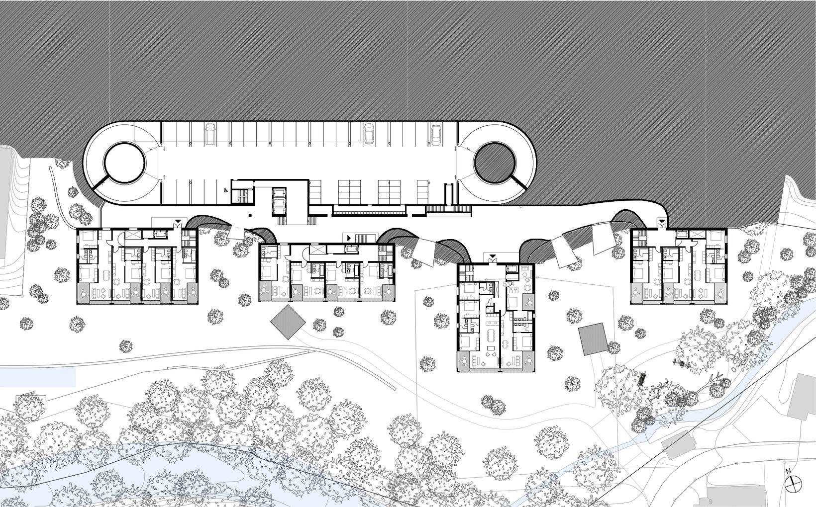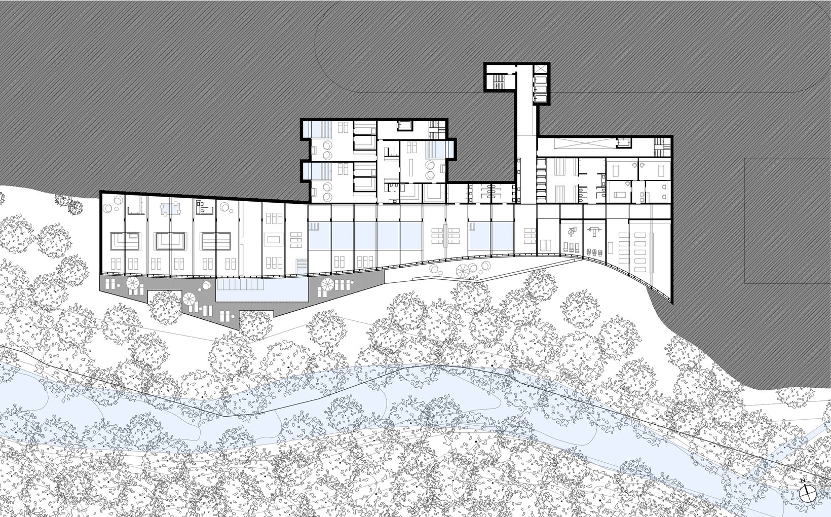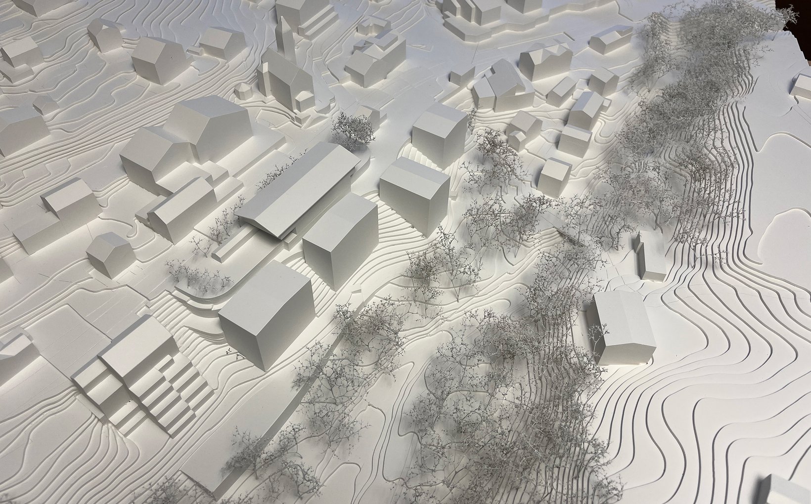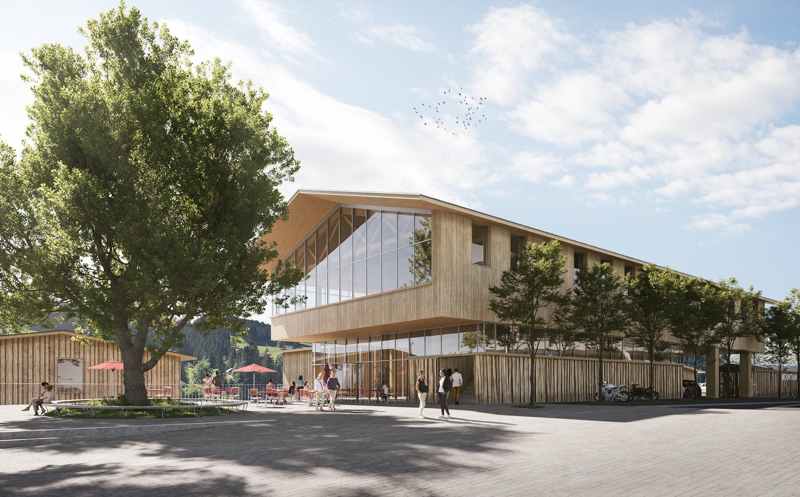 Das Projekt sieht ein Ensemble von fünf Einzelbauten vor, deren lockere und durchlässige Setzung Bezug nimmt zur Bebauung am Ort. Die vier Wohnhäuser stehen markant im Wiesenhang. Der Hang steigt kontinuierlich von der Waldemme zur Terrasse des Dorfweges hoch. Oberhalb des Dorfweges liegt die Esplanade an der Rothornstrasse, wo grosszügige Vorplätze den Besucher der Mountain-Lodge in das Empfangsgebäude führen. Darüber thront der grosse Raum des Restaurants mit einem 270° Panorama. Ganz unten, am Fuss des Wiesenhanges schmiegt sich der kaum wahrnehmbarer Gebäudekörper des Spa an den Waldrand.