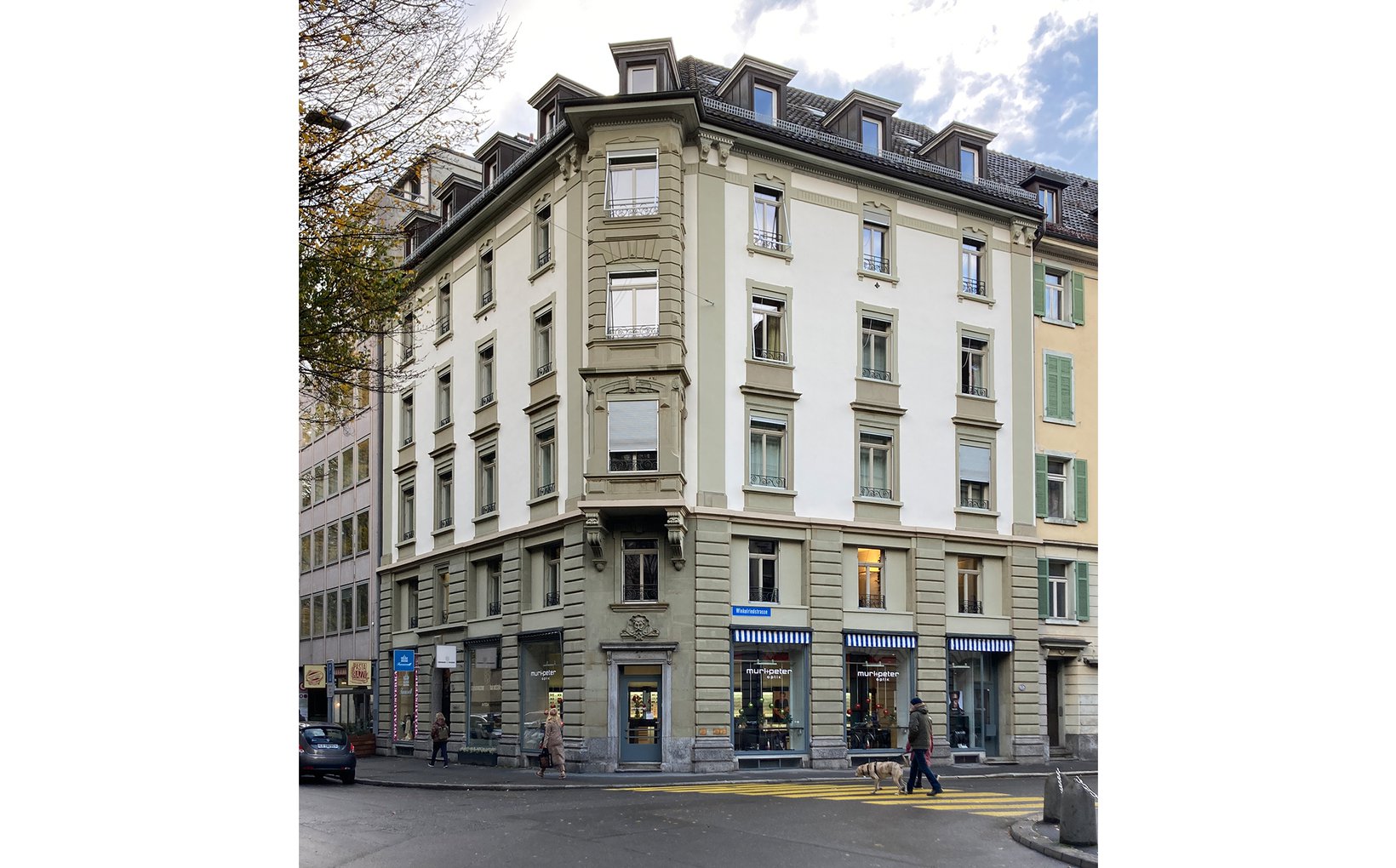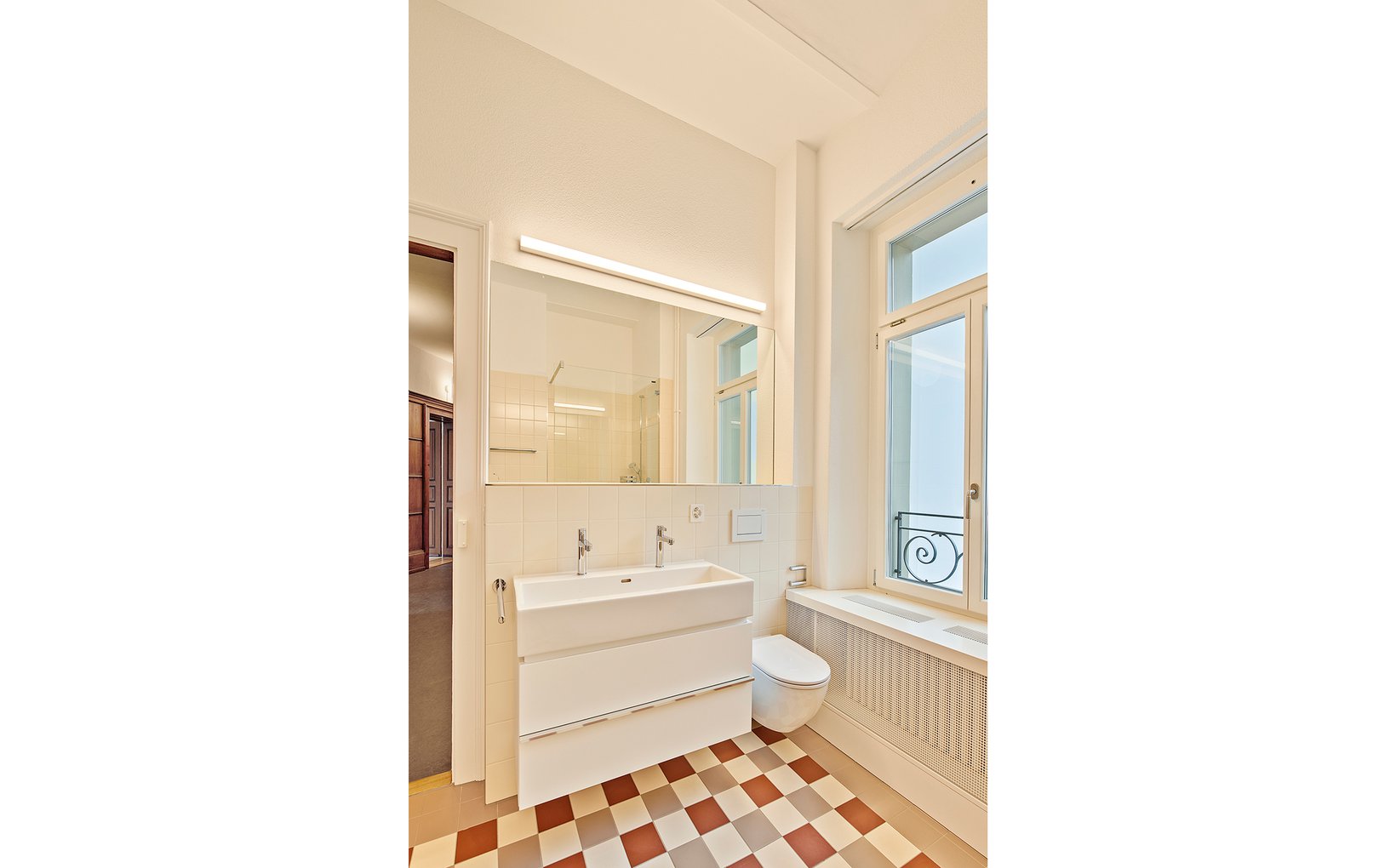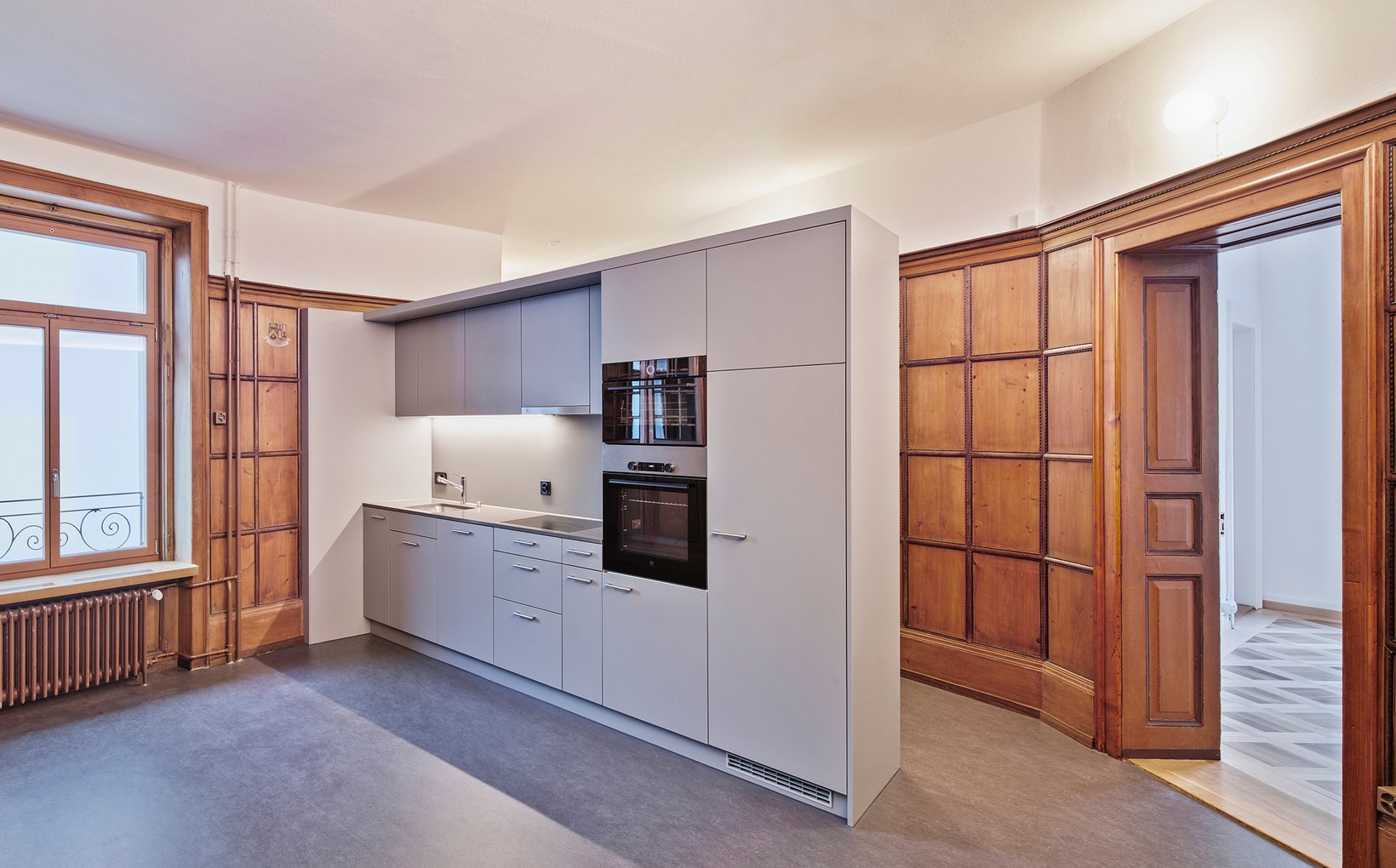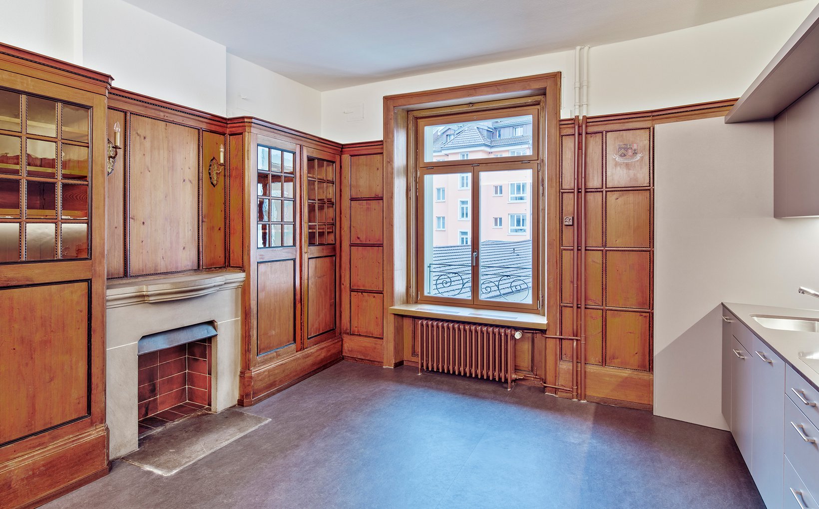 Im 2. Obergeschoss des Ende 19. Jahrhundert erbauten Gebäudes werden Büroräume in Wohnungen umgenutzt. Die um 1915 ausgebaute Halle bildet das Herzstück der grossen Wohnung und wird als zentraler Essraum mit Küche das Zentrum der Wohnung. Die neuen Fenster werden wieder an die ursprüngliche Einteilung angepasst. Durch den gepflegten Bestand können die Zimmer ihren Charakter alle behalten.