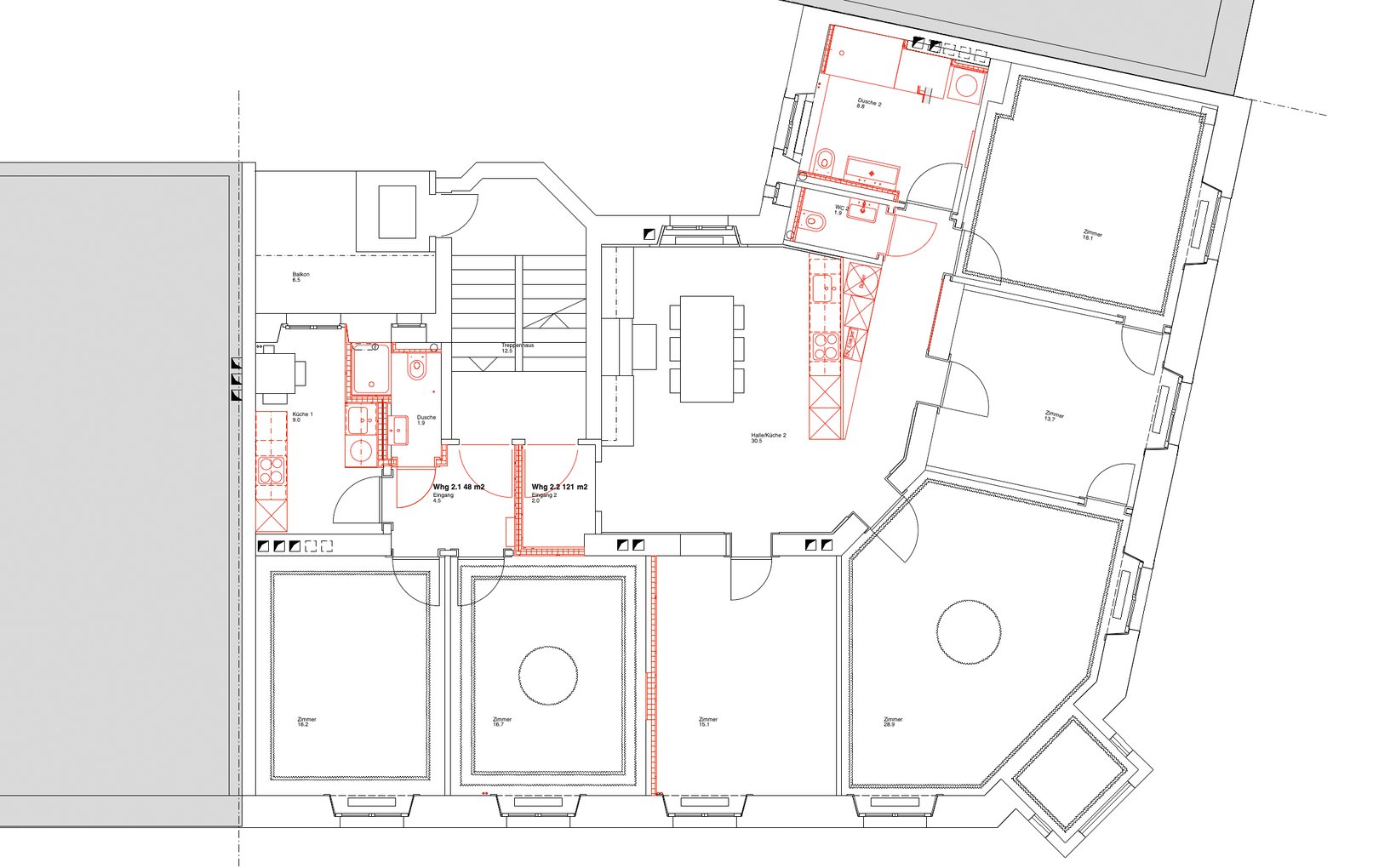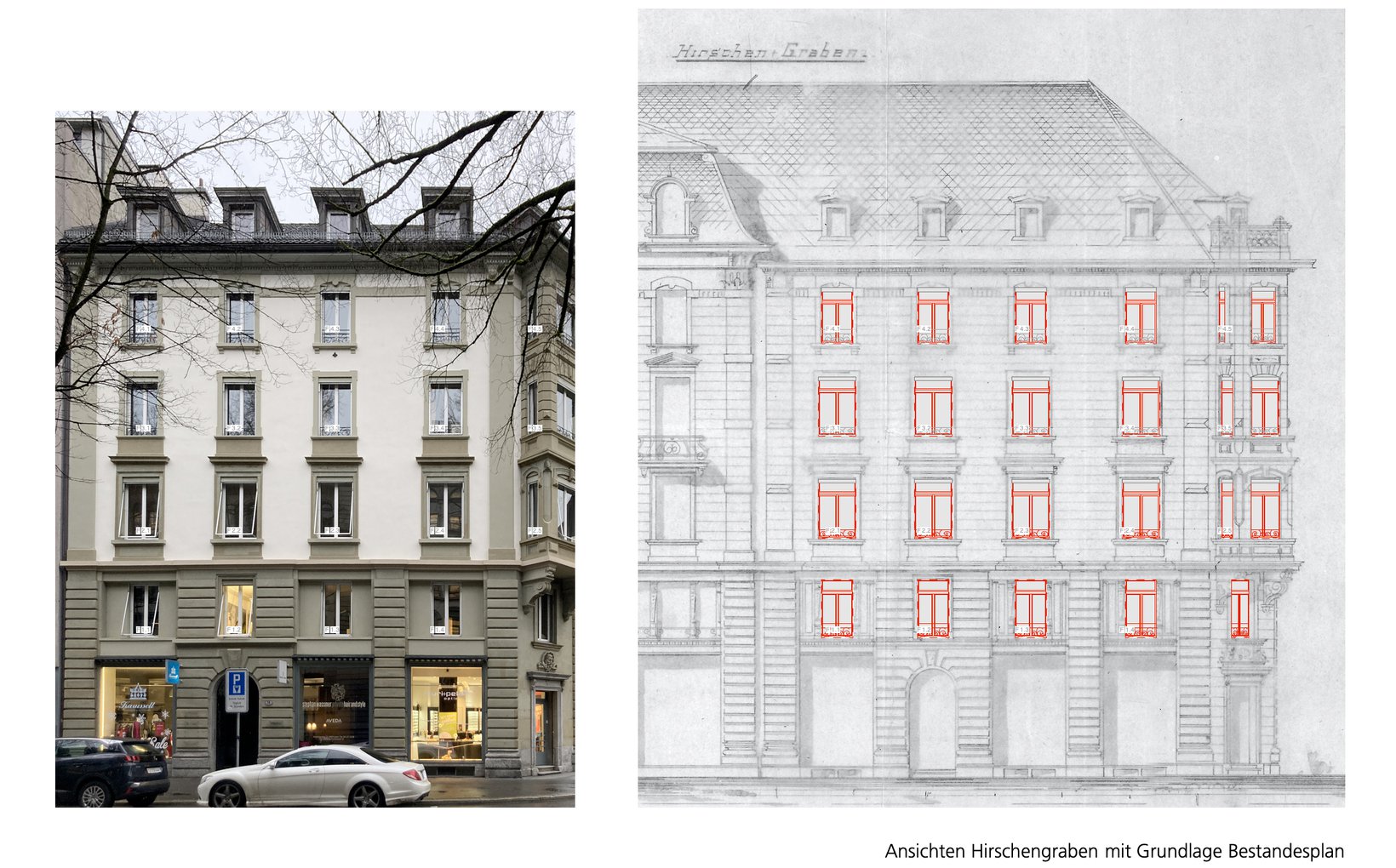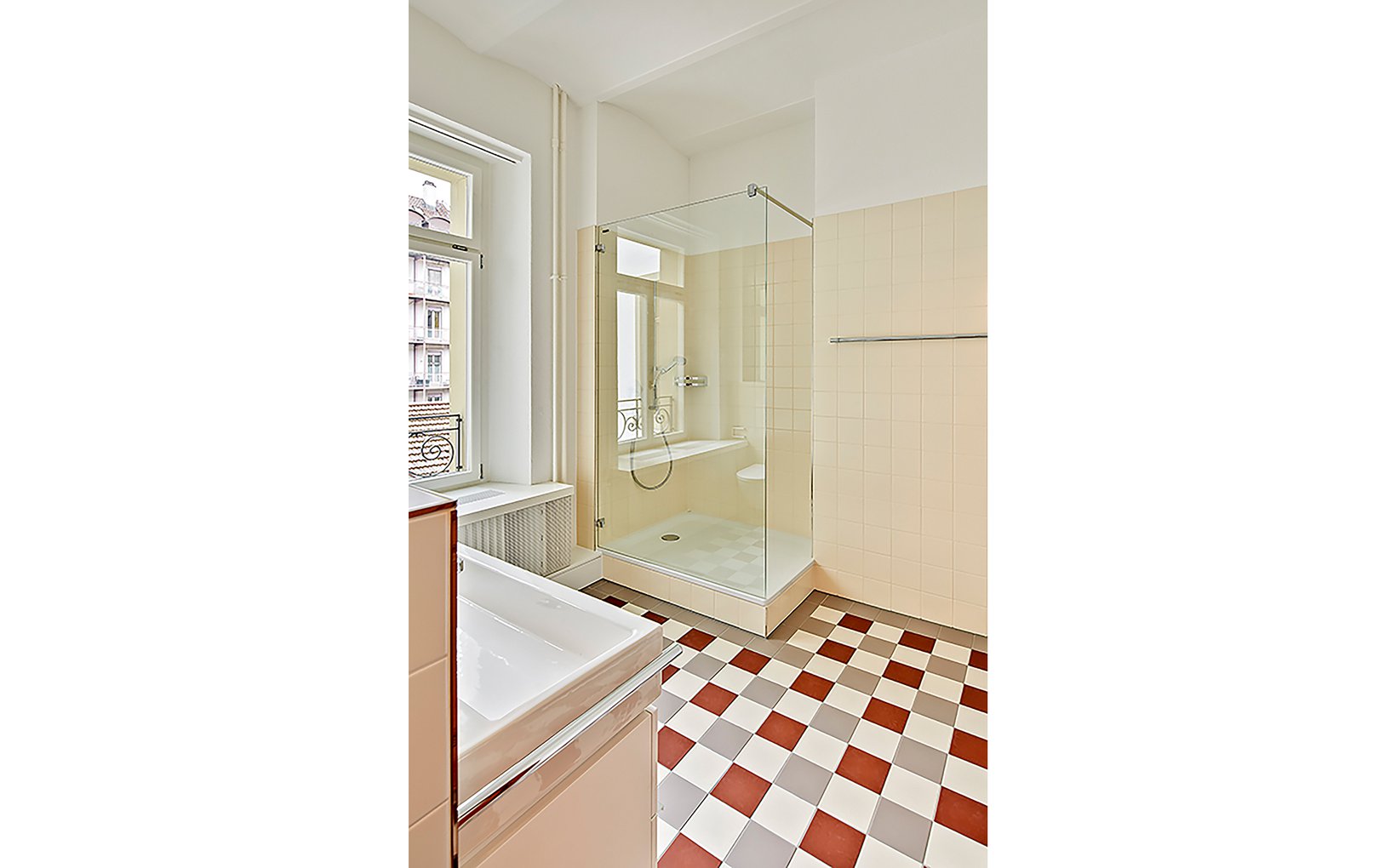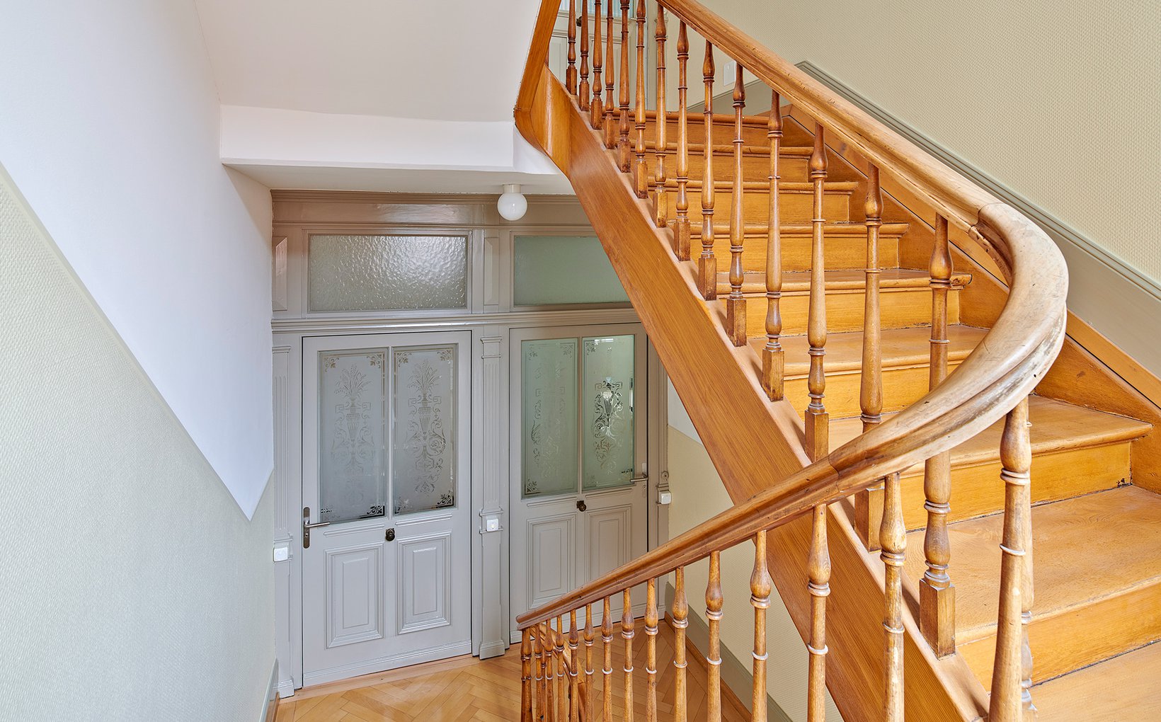 Im 2. Obergeschoss des Ende 19. Jahrhundert erbauten Gebäudes werden Büroräume in Wohnungen umgenutzt. Die um 1915 ausgebaute Halle bildet das Herzstück der grossen Wohnung und wird als zentraler Essraum mit Küche das Zentrum der Wohnung. Die neuen Fenster werden wieder an die ursprüngliche Einteilung angepasst. Durch den gepflegten Bestand können die Zimmer ihren Charakter alle behalten.