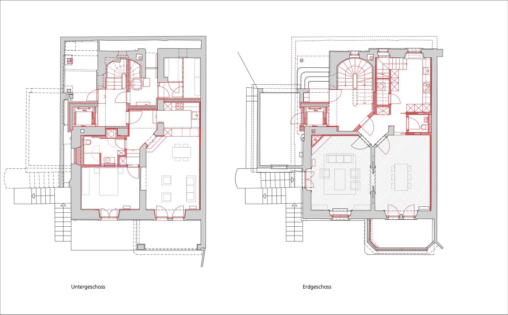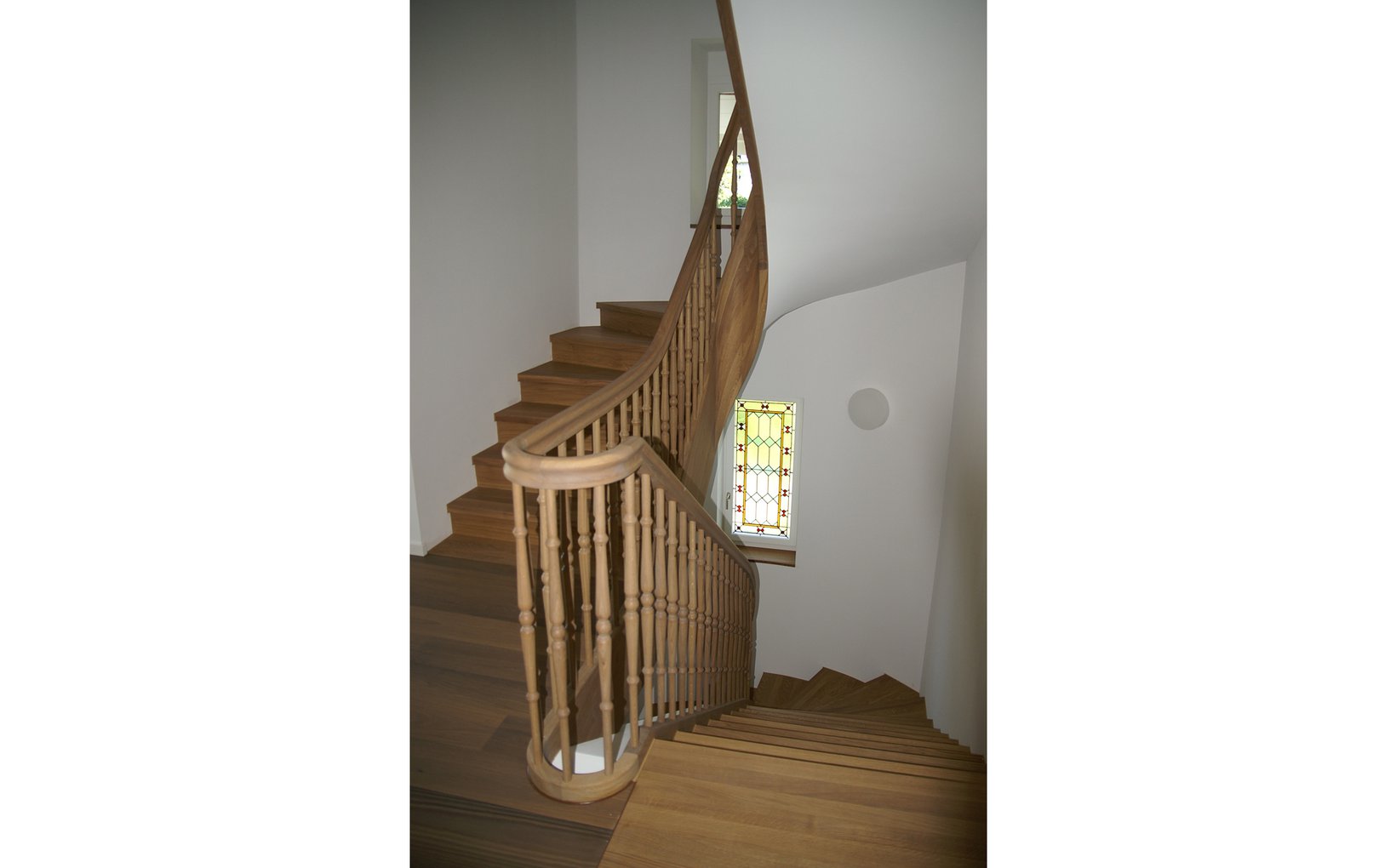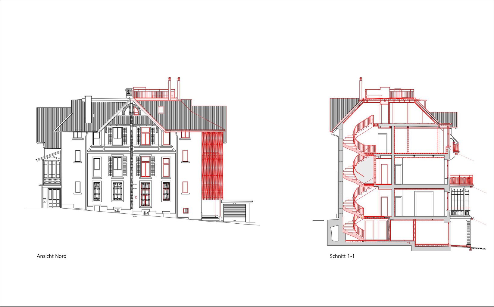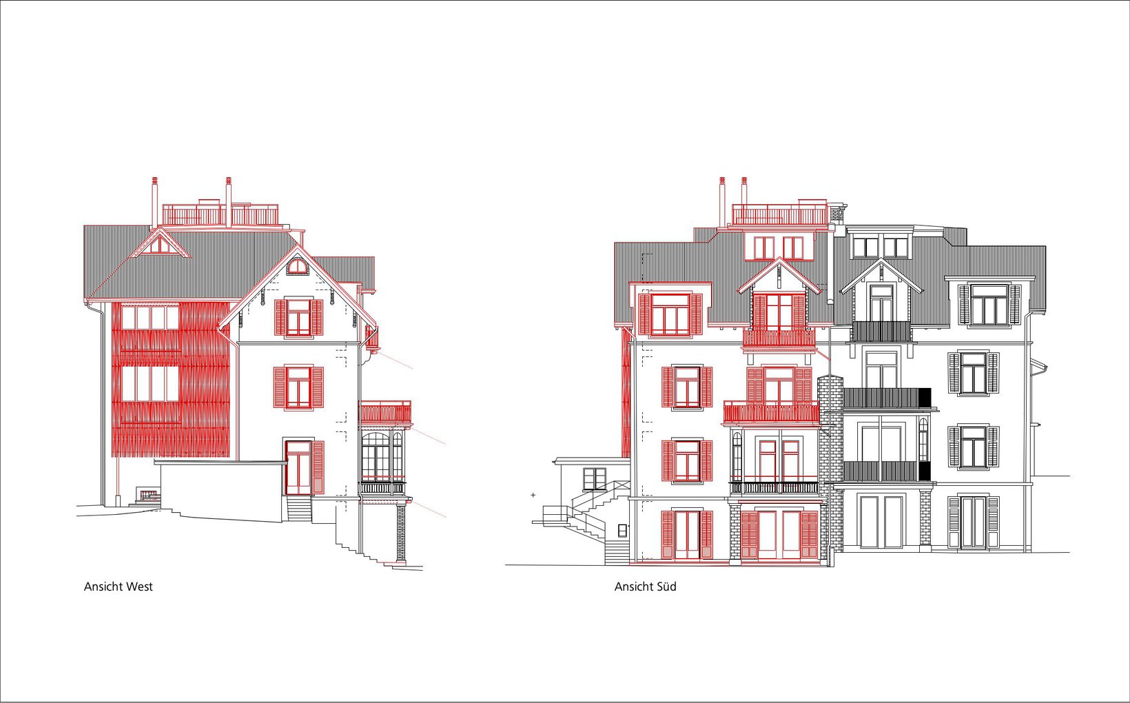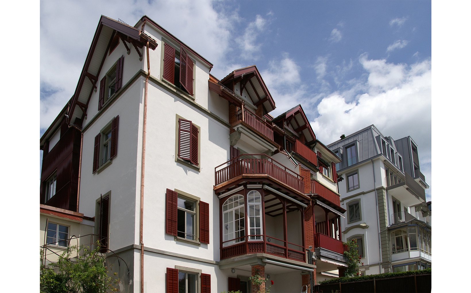 Das bestehende Haus an der Adligenswilerstrasse wurde 1904 als Doppeleinfamilienhaus durch den Architekten Arnold Bringolf geplant. Die eine Hälfte des 5-geschossigen Hauses wird neu in 3 Wohnungen unterteilt. Die Kleinwohnung ist im Untergeschoss auf Gartenniveau. Die beiden grossen Wohnungen sind je auf 2 Geschossen verteilt. Die vorderen Räume werden belassen, im rückwärtigen Bereich gibt es Anpassungen mit den Küchen bzw. Nasszellen. Damit die Zugänglichkeit für Bewohner verbessert wird, wird ein Lift angebaut. Die gewählte Lage ausserhalb des massiven Gebäudes, bietet die Chance die bestehende Struktur zu belassen. Der Lift wird in die neue Veranda integriert, welche zusammen mit weiteren ergänzenden Elementen als Zierelemente dienen, wie sie am Gebäude bereits bestehen. Die Konstruktion der Veranda ist geprägt durch das Thema der gedrechselten Holzstäbe des Bestandes und interpetiert diese neu mit einer Metallkonstruktion.