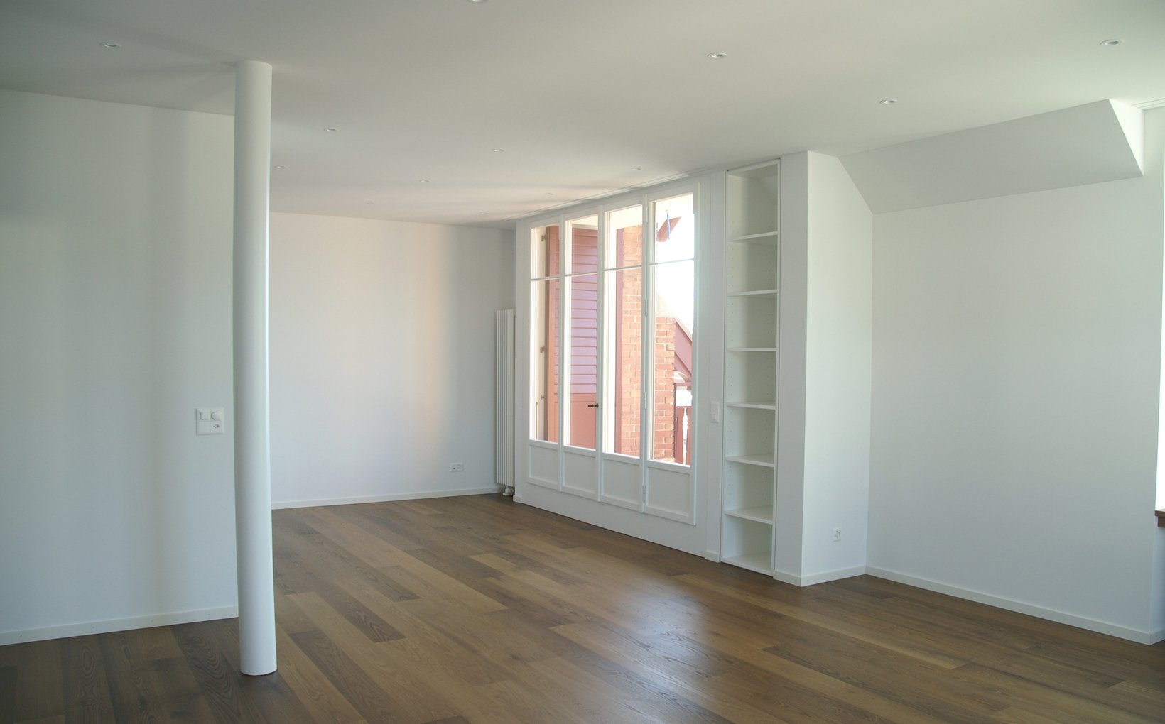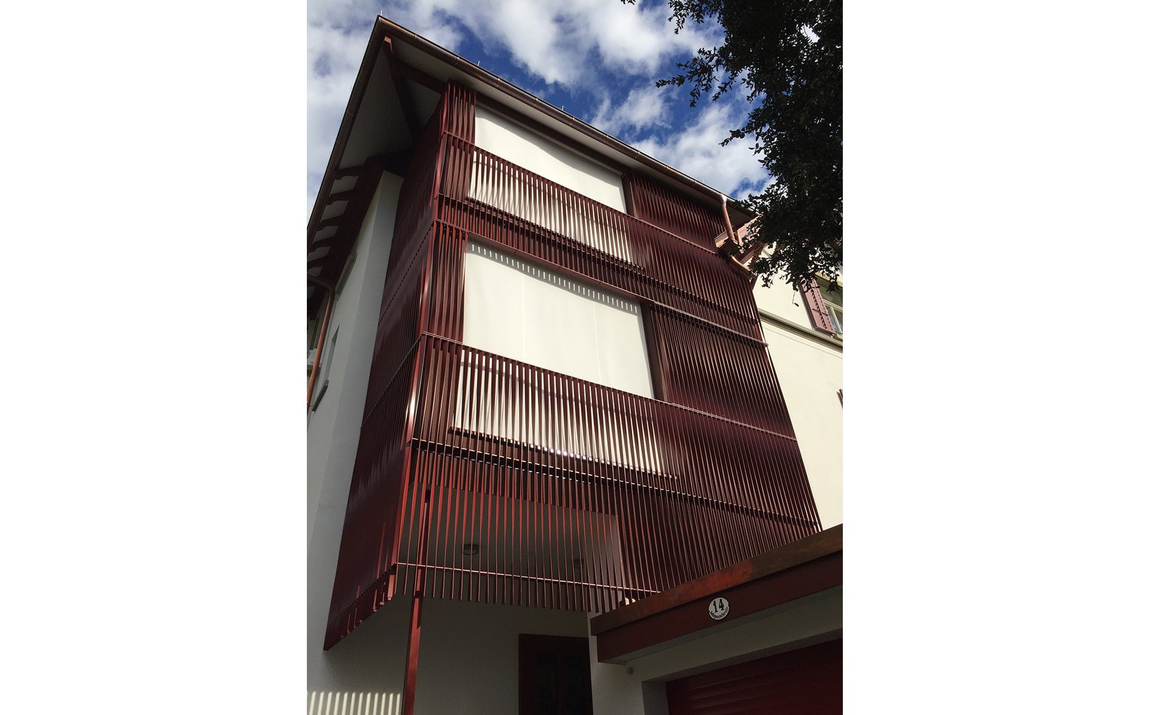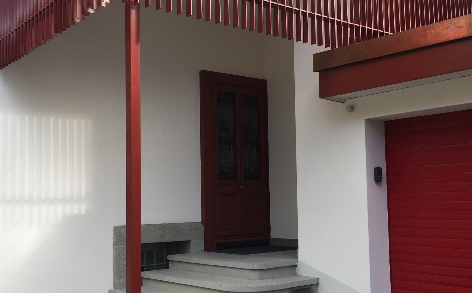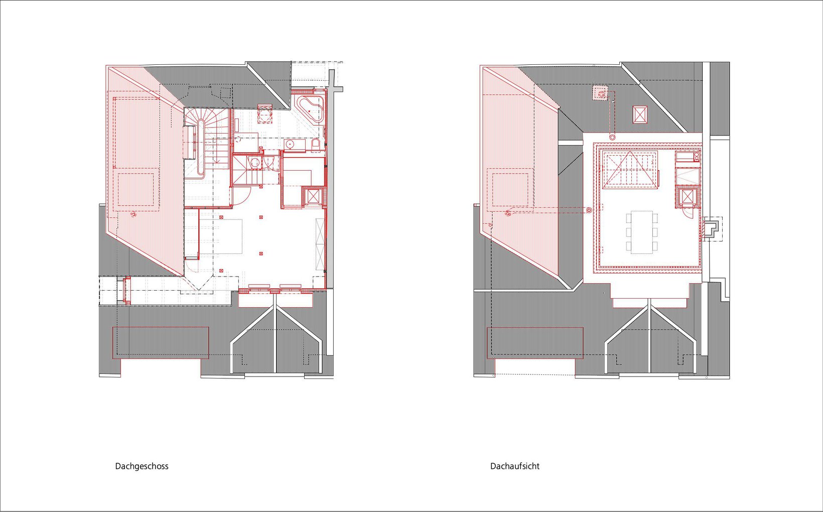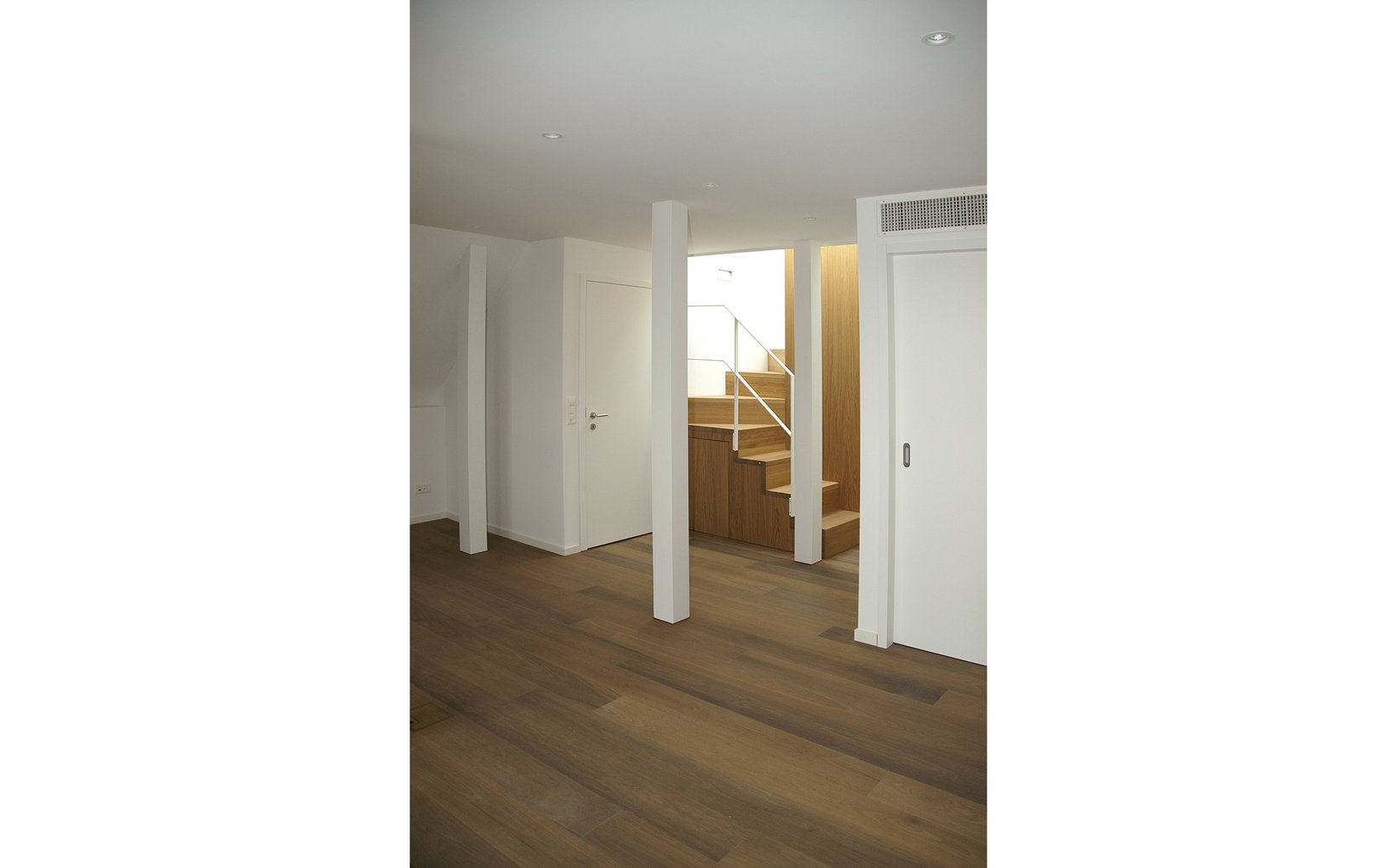 Das bestehende Haus an der Adligenswilerstrasse wurde 1904 als Doppeleinfamilienhaus durch den Architekten Arnold Bringolf geplant. Die eine Hälfte des 5-geschossigen Hauses wird neu in 3 Wohnungen unterteilt. Die Kleinwohnung ist im Untergeschoss auf Gartenniveau. Die beiden grossen Wohnungen sind je auf 2 Geschossen verteilt. Die vorderen Räume werden belassen, im rückwärtigen Bereich gibt es Anpassungen mit den Küchen bzw. Nasszellen. Damit die Zugänglichkeit für Bewohner verbessert wird, wird ein Lift angebaut. Die gewählte Lage ausserhalb des massiven Gebäudes, bietet die Chance die bestehende Struktur zu belassen. Der Lift wird in die neue Veranda integriert, welche zusammen mit weiteren ergänzenden Elementen als Zierelemente dienen, wie sie am Gebäude bereits bestehen. Die Konstruktion der Veranda ist geprägt durch das Thema der gedrechselten Holzstäbe des Bestandes und interpetiert diese neu mit einer Metallkonstruktion.