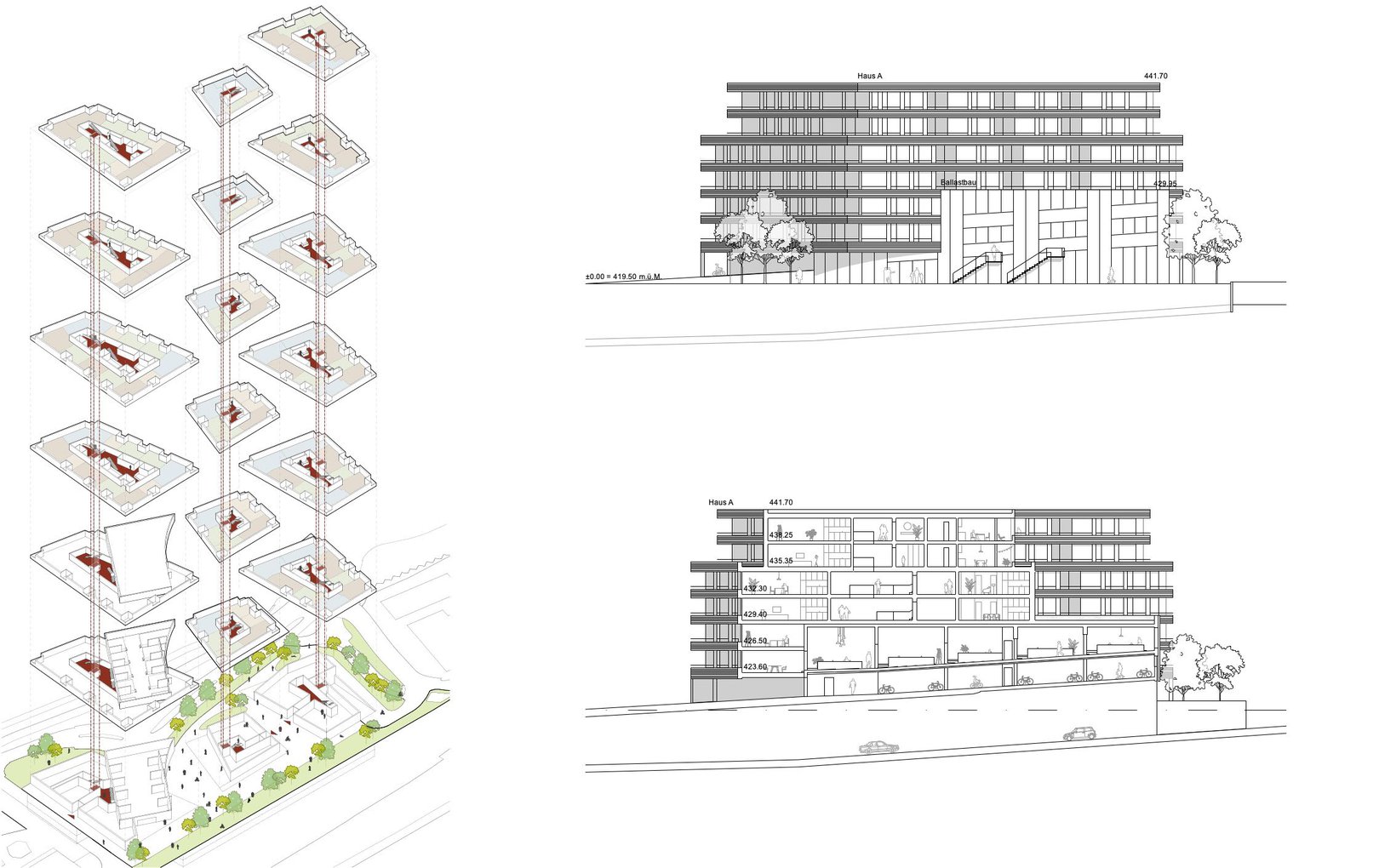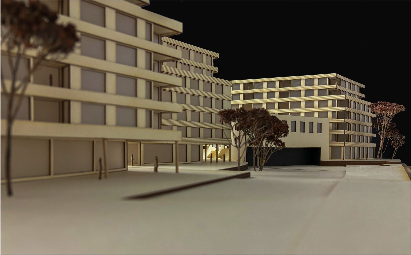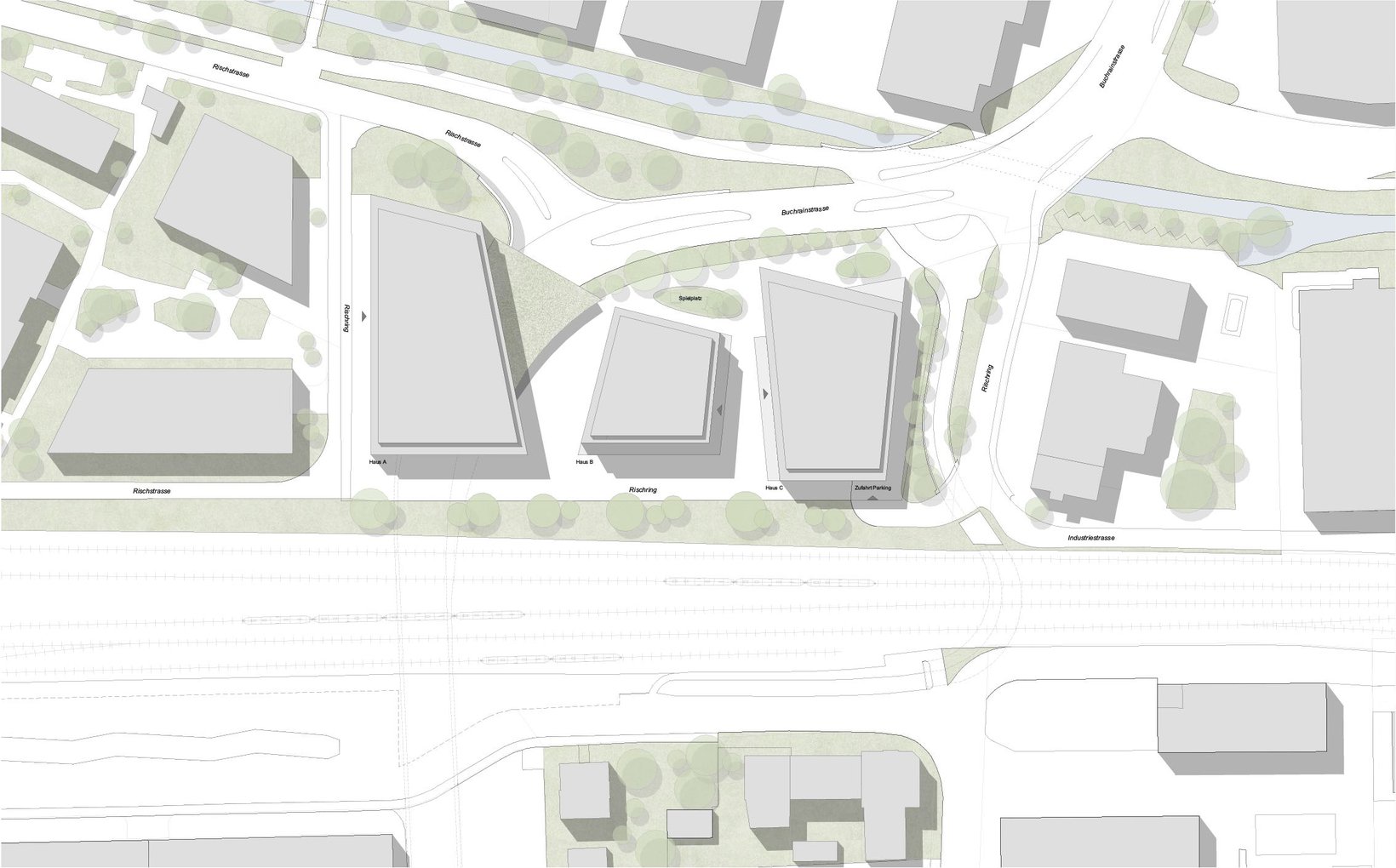 Es besteht die Möglichkeit, eine bestimmte Obstsorte auf eine junge Unterlage zu zweien, indem man dem Baum dieser Obstsorte Edelreiser entnimmt, z.B. einem Apfelbaum, und diese auf einen jungen Apfelbaum zweit. Tunnel und Ballastbau spielen die Unterlage mit Wurzel. Die neuen Wohnhäuser haben die Rolle der Edelreiser, welche Richtung Himmel wachsen. Unser Projekt «Zweien» schafft ein dichtes Raumgefüge zwischen dem Geleisefeld und der Ron, dort wo die Strasse nach Buchrain und der Veloweg aus dem Untergrund auftauchen.Mit der Setzung von drei Gebäudekörpern entsteht mit dem «CityLink» ein poröser urbaner Baustein. Die Durchlässigkeit der Parzelle ermöglicht die Durchsicht zwischen Geleiseanlage und Ron. Diese Zwischenräume, welche vielfältige Bezüge zwischen den Häusern, aber auch zwischen vorne und hinten schaffen, zeichnen den neuen Ort aus.