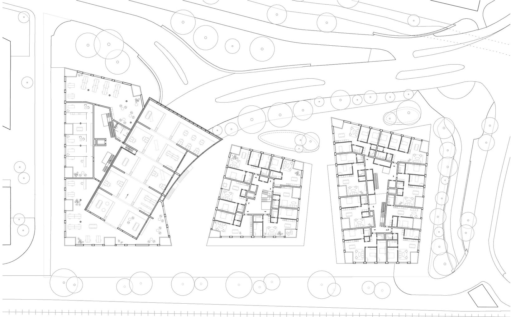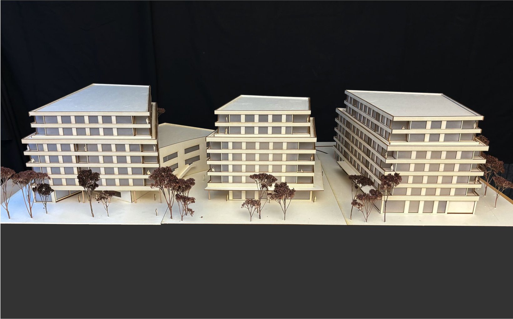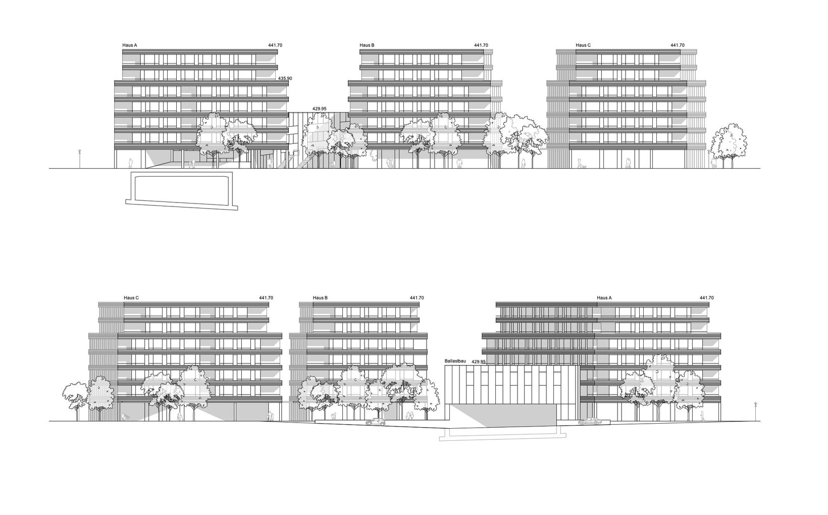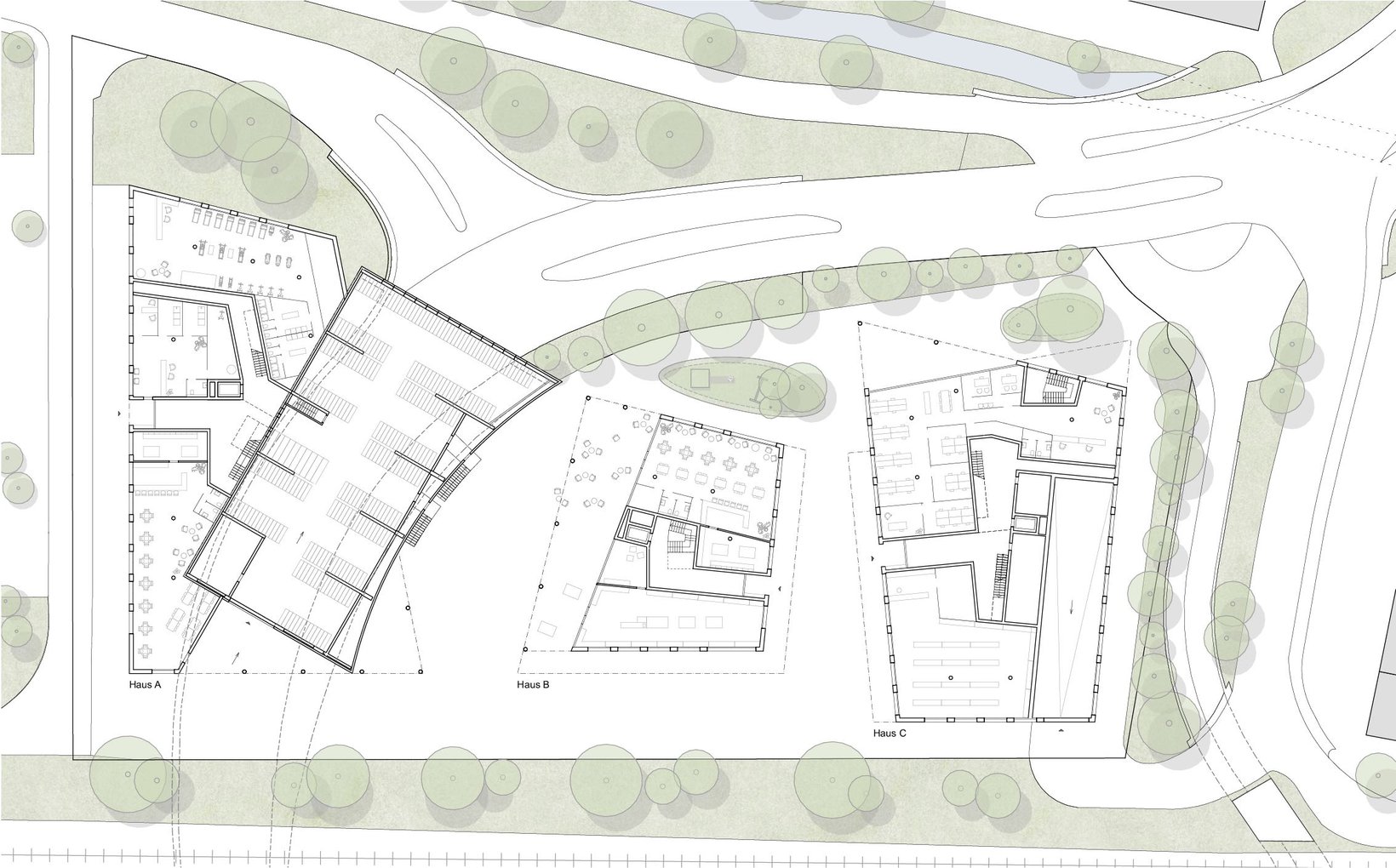 Es besteht die Möglichkeit, eine bestimmte Obstsorte auf eine junge Unterlage zu zweien, indem man dem Baum dieser Obstsorte Edelreiser entnimmt, z.B. einem Apfelbaum, und diese auf einen jungen Apfelbaum zweit. Tunnel und Ballastbau spielen die Unterlage mit Wurzel. Die neuen Wohnhäuser haben die Rolle der Edelreiser, welche Richtung Himmel wachsen. Unser Projekt «Zweien» schafft ein dichtes Raumgefüge zwischen dem Geleisefeld und der Ron, dort wo die Strasse nach Buchrain und der Veloweg aus dem Untergrund auftauchen.Mit der Setzung von drei Gebäudekörpern entsteht mit dem «CityLink» ein poröser urbaner Baustein. Die Durchlässigkeit der Parzelle ermöglicht die Durchsicht zwischen Geleiseanlage und Ron. Diese Zwischenräume, welche vielfältige Bezüge zwischen den Häusern, aber auch zwischen vorne und hinten schaffen, zeichnen den neuen Ort aus.