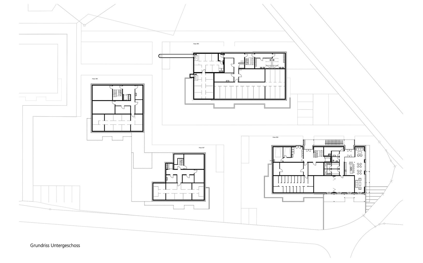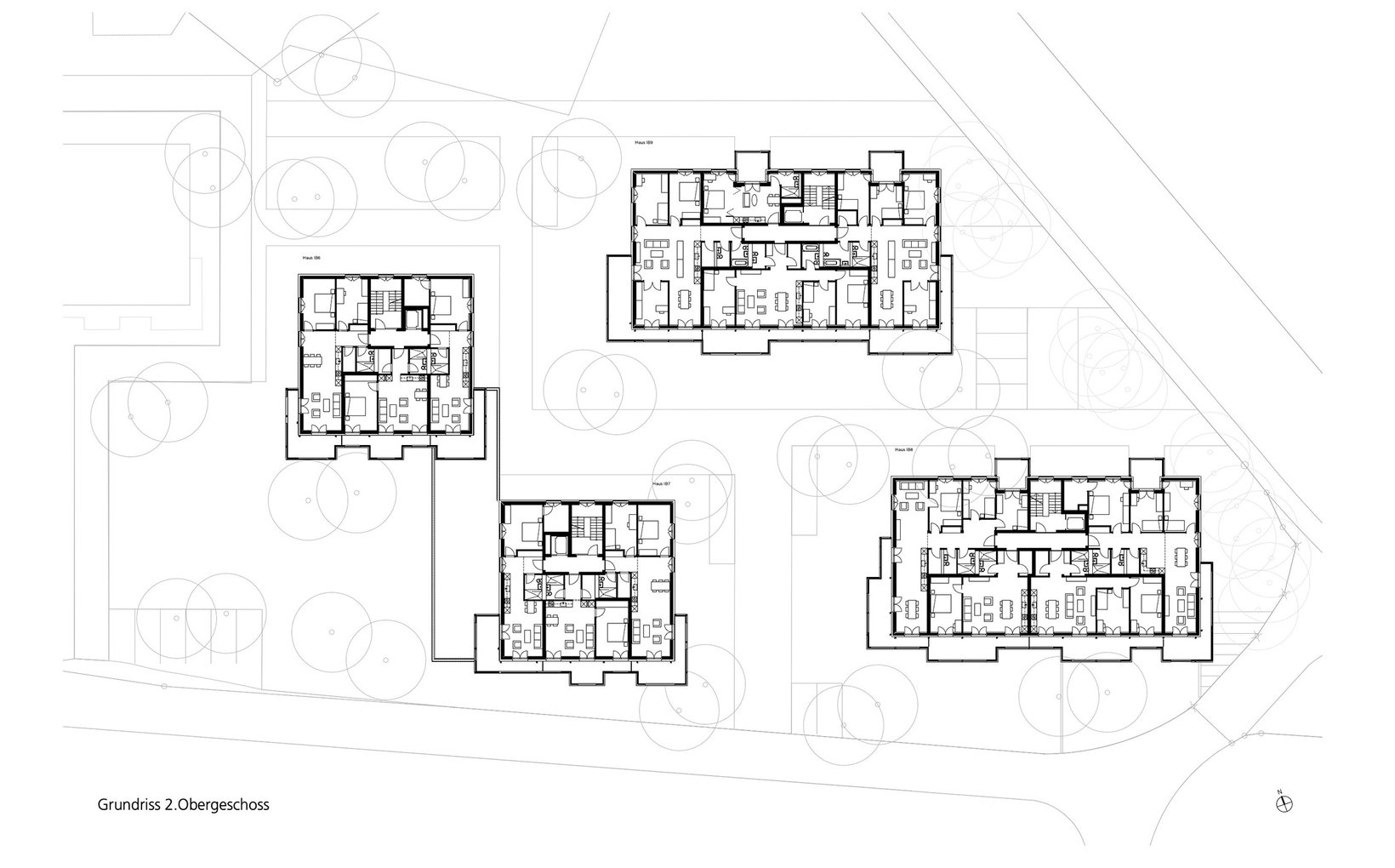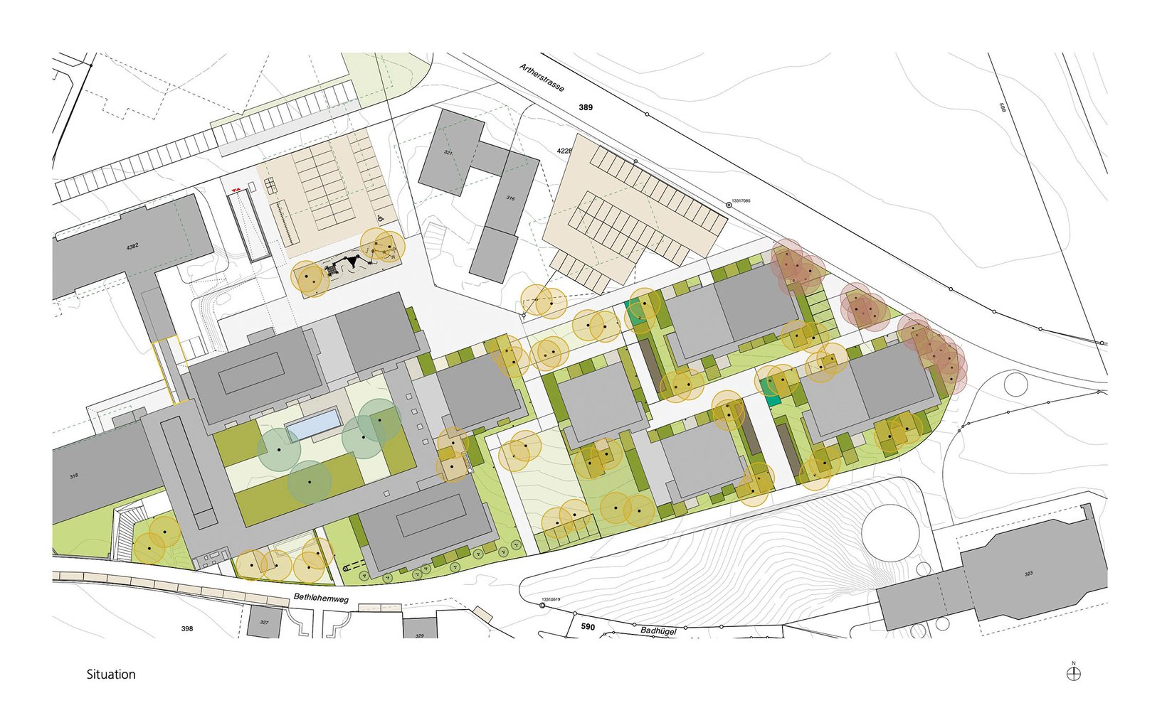 Der Hof des Missionshauses vom Architekten Otto Glaus aus dem Jahr 1957 ist der eindrücklichste Aussenraum auf dem Areal. Er bleibt erhalten und wird zum neuen Quartierhof. Die 12 neuen Wohnhäuser mit rund 150 Wohnungen sind einfache, vier- bis fünfgeschossige Einzelbauten. Sie liegen so, dass die Gesamtüberbauung für die Sonne und für Aus- und Durchblicke durchlässig ist.