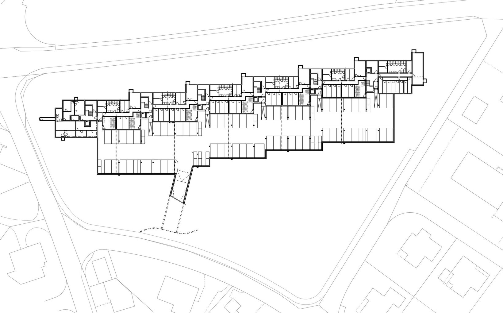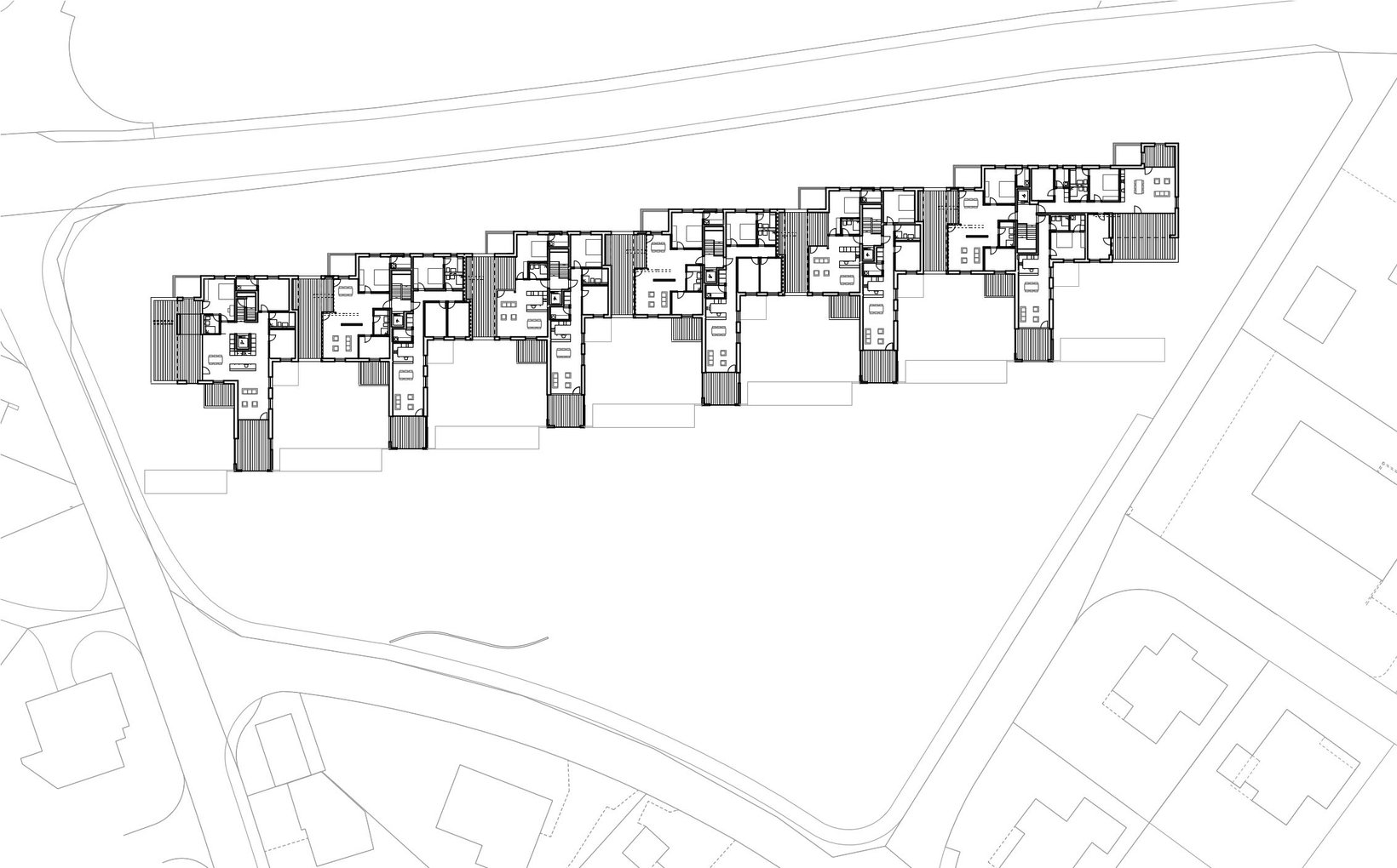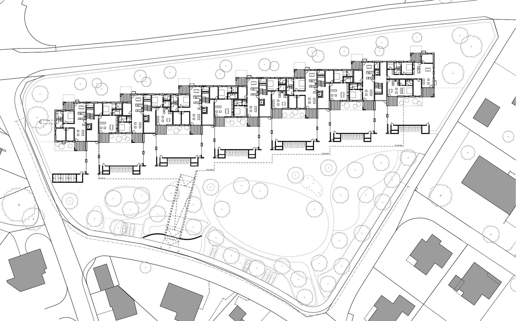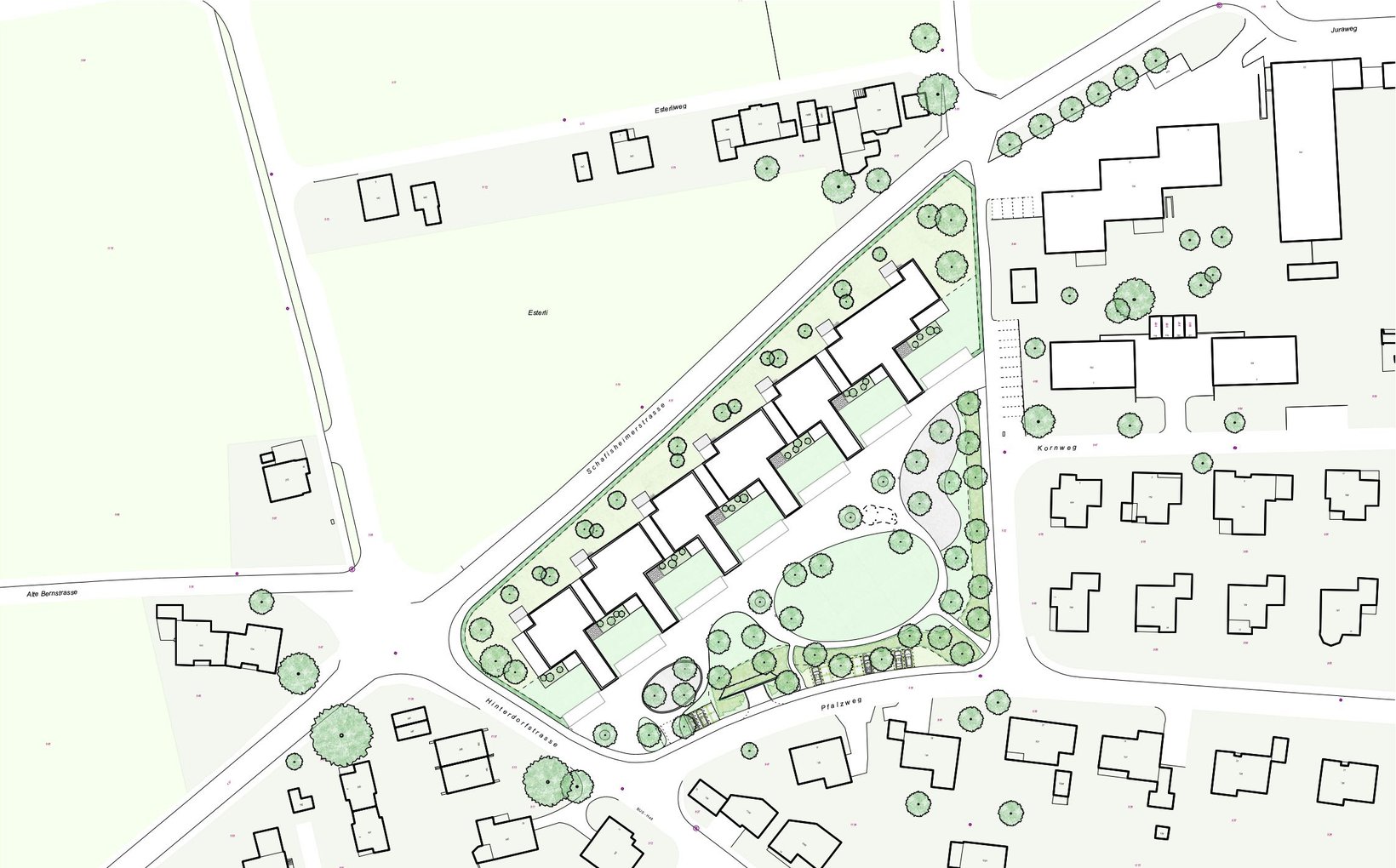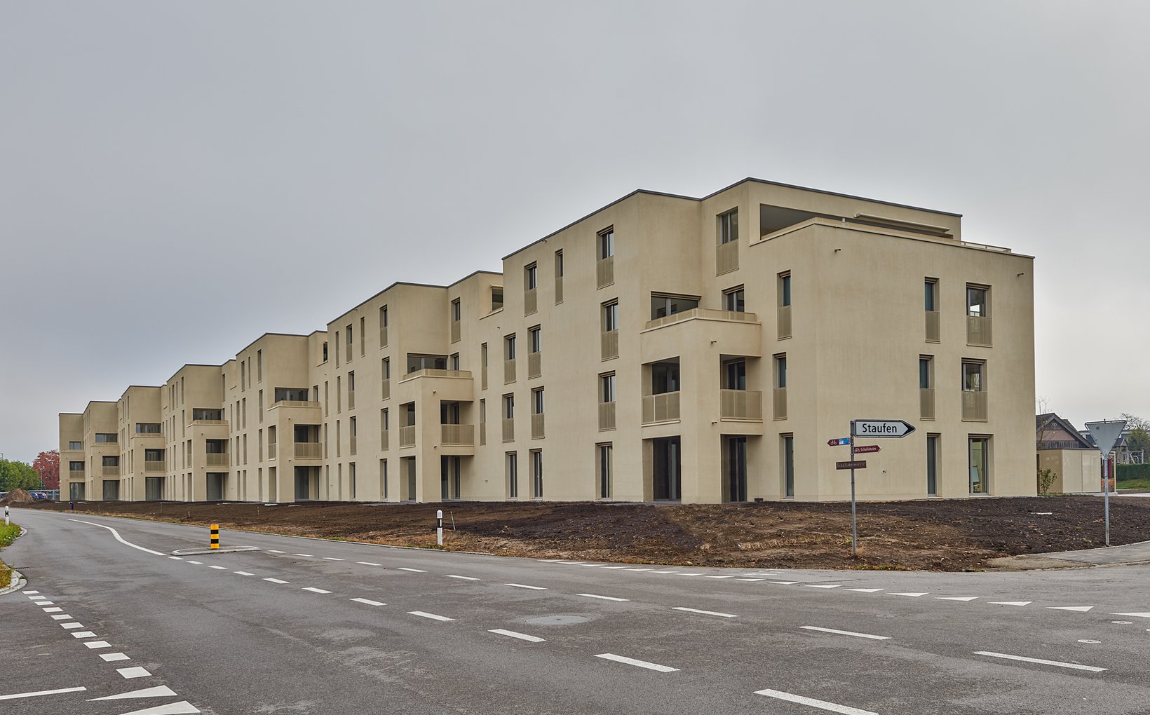 Umgeben von Einfamilienhäusern, liegt die Parzelle mit Sicht nach Süden auf den Staufberg und die Staufbergkirche. Das Gebäudevolumen liegt am nördlichen Parzellenrand; im Süden entsteht ein grosser parkähnlicher Freiraum, welcher einen ersten Aussichtshorizont für die Wohnungen bietet. Die Gebäudestruktur wird aus unserem Projekt Viehmarktareal in Lenzburg weiterentwickelt und auf die Situation in Staufen angepasst. Entstanden ist wiederum ein stark gegliederter Gebäudekörper, welcher kleinmassstäbliche und vielgestaltige Aussenräume generiert.