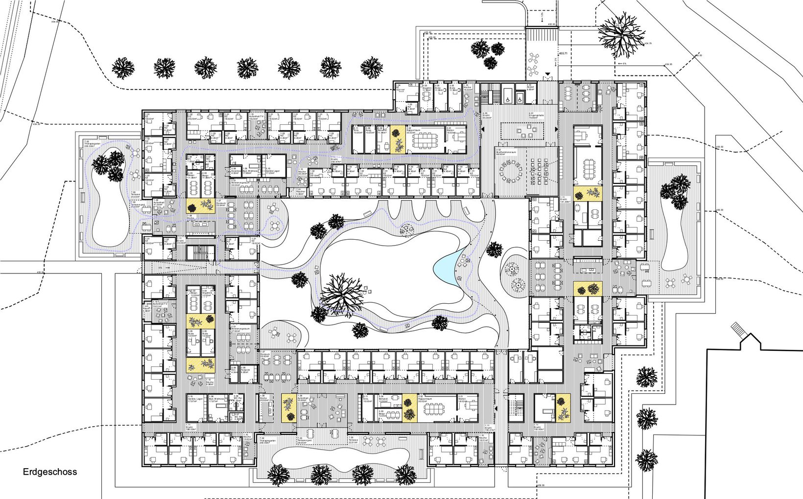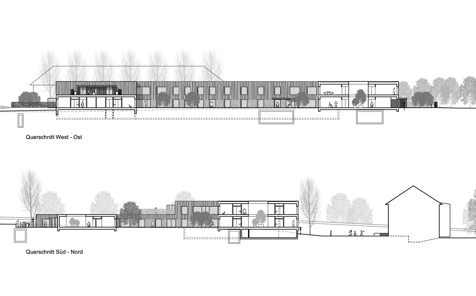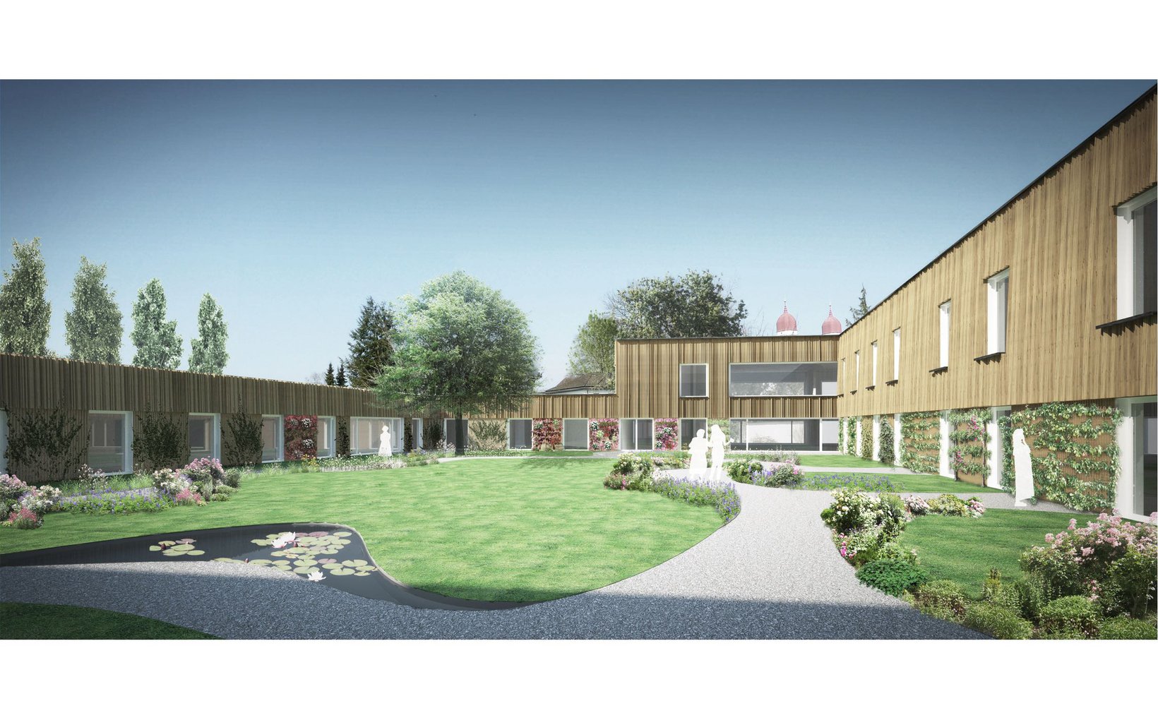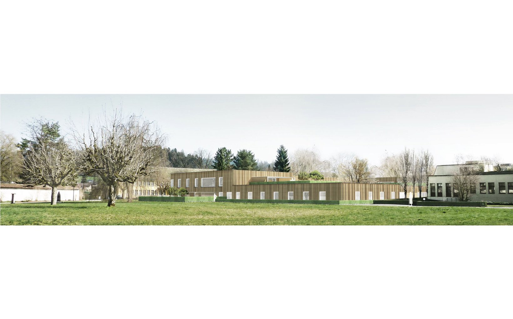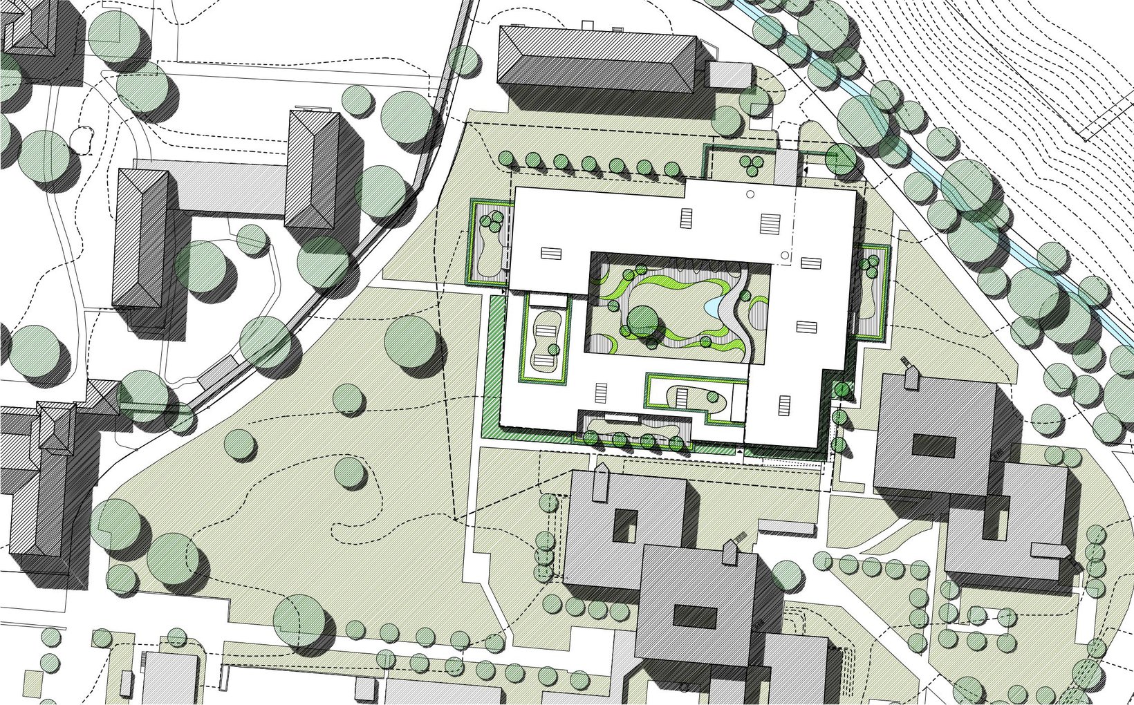 Der neue Baukörper schiebt sich zwischen die moderne Klinik-Anlage und die historischen Bauten. Seine Flachheit und seine markante und feingliedrig-bewegte Fassadentextur aus Fichten-Baumkanten integrieren ihn klar in die landschaftlich natürliche Facette des Ortes. Somit vermittelt er zwischen historischen und modernen Anlageteilen, indem er einen angenehmen Abstand dazwischen schafft.