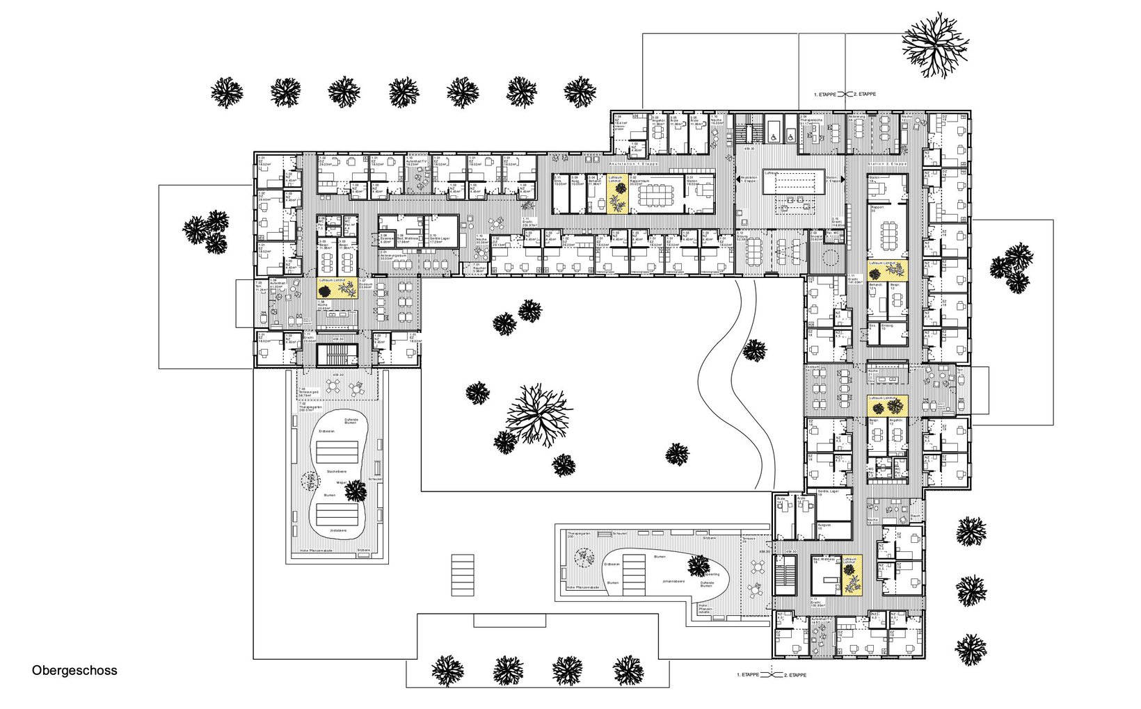 Auf das vis-a-vis der Nachbarbauten reagiert der Baukörper mit dem präzisen Zurückweichen der Aussenfassaden. Damit wird Distanz geschaffen und es spannen sich Aussenräume auf, welche einen spielerischen Dialog zwischen Bestehendem und Neuem schaffen.