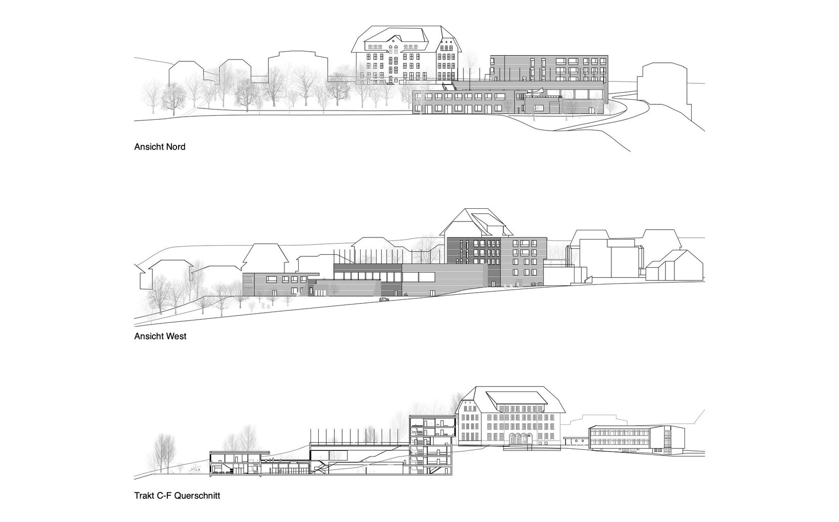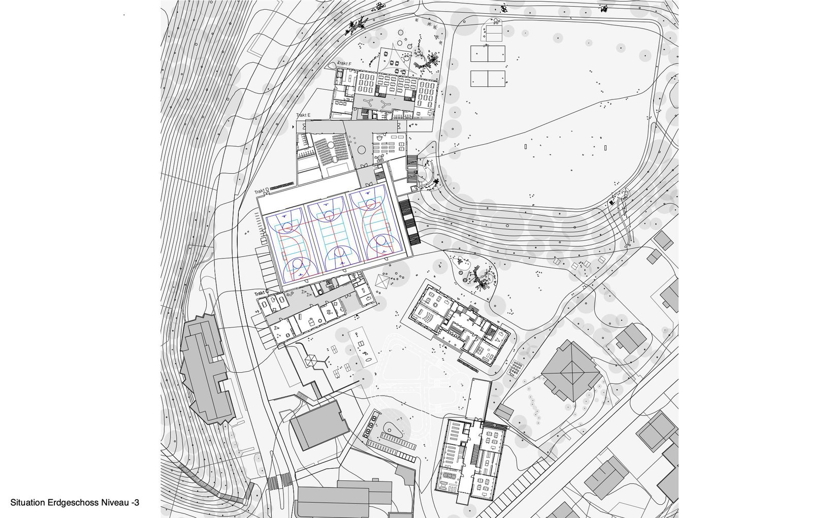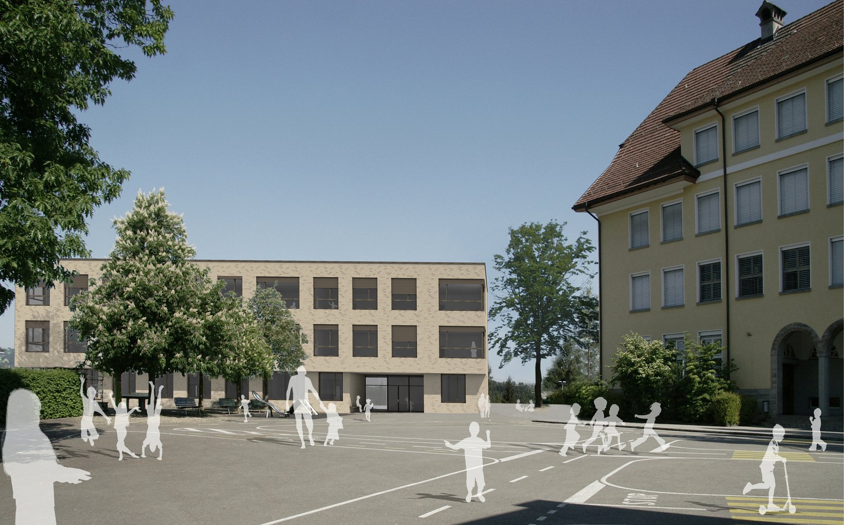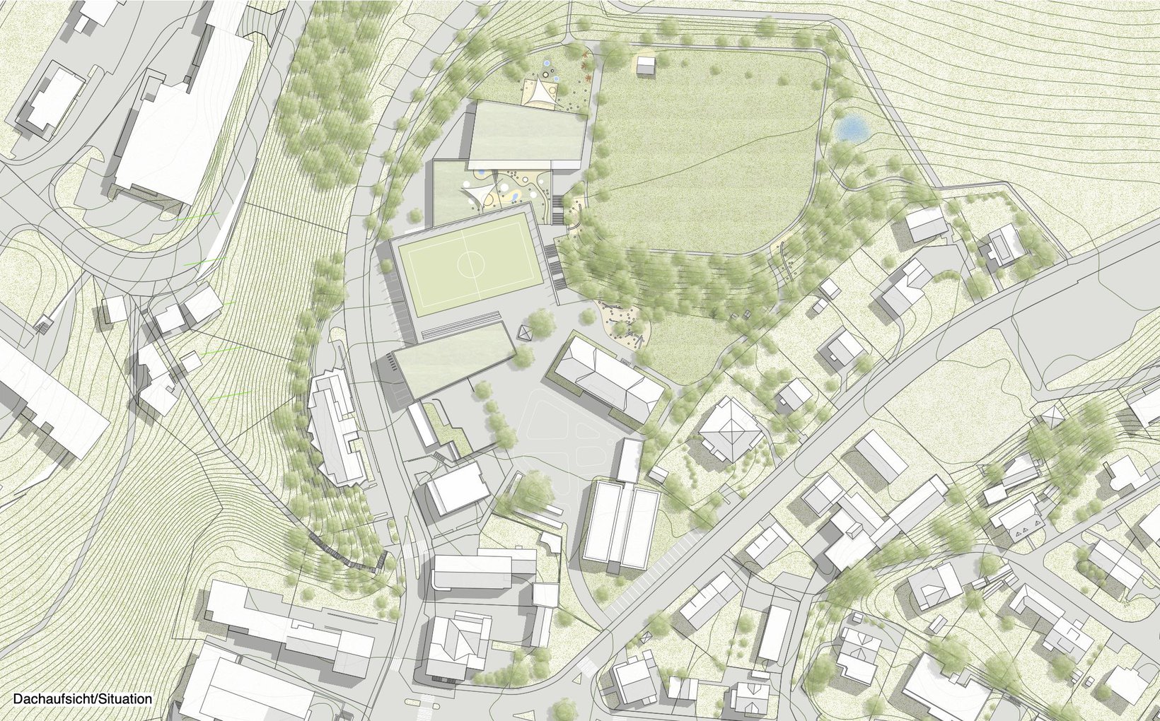Der Schulhausplatz ist das Zentrum der gesamten Schulanlage. Die bestehenden 2 Schultrakte A und B bilden einen wichtigen Bestandteil der Identität der Schule Dorf. Durch die Setzung des neuen Schultraktes an der Hangkante wird der Schulhausplatz räumlich gefasst. Der Raum zwischen dem neuen und dem alten Gebäude öffnet sich zur Landschaft hin. Er gibt den Blick frei auf die absteigenden Stufen des neuen Baukörpers und auf den neuen, grossen naturnahen Aussenraum der Schule auf der unteren Ebene.