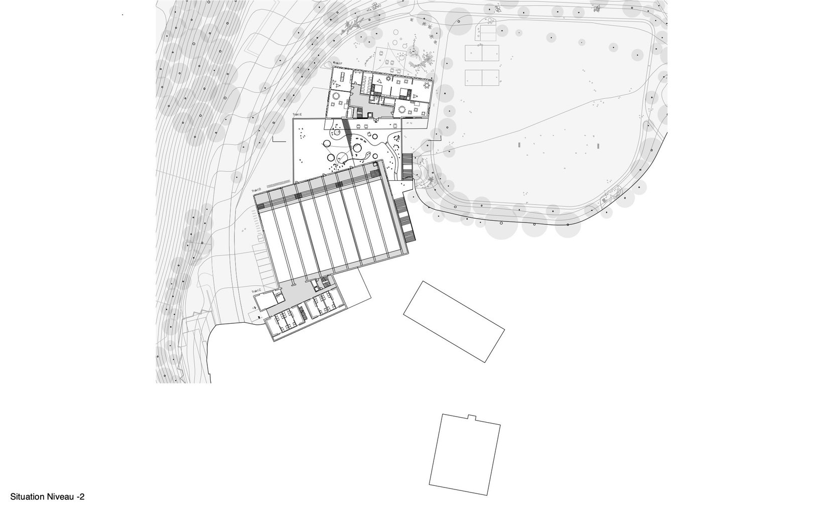 Das neue Gebäude entwickelt sich aus der Hangkante her heraus und verbindet die beiden Ebenen. Es fächert sich auf und begleitet so die Bewegung der Cheerstrasse. Es wird Teil der Landschaft.