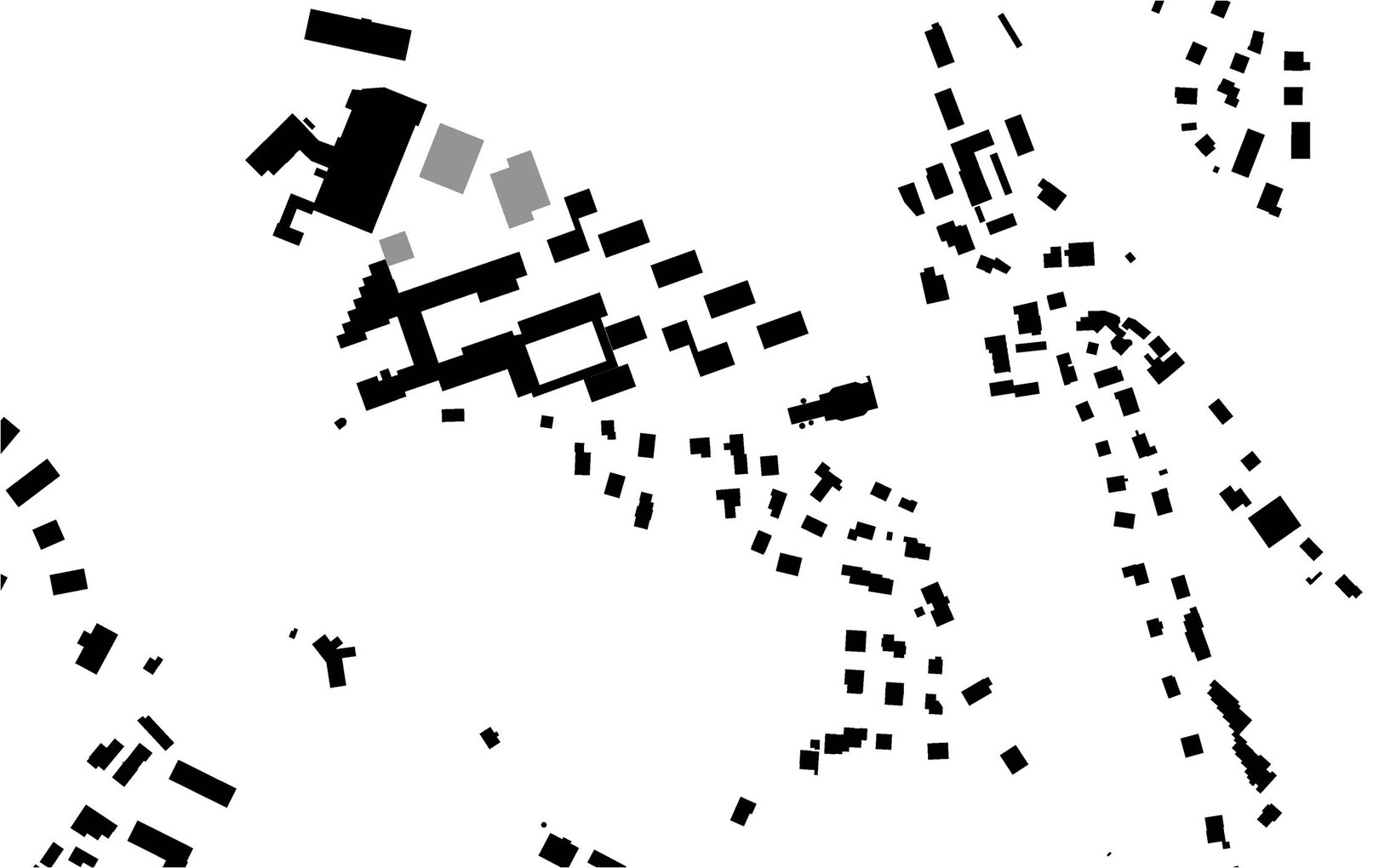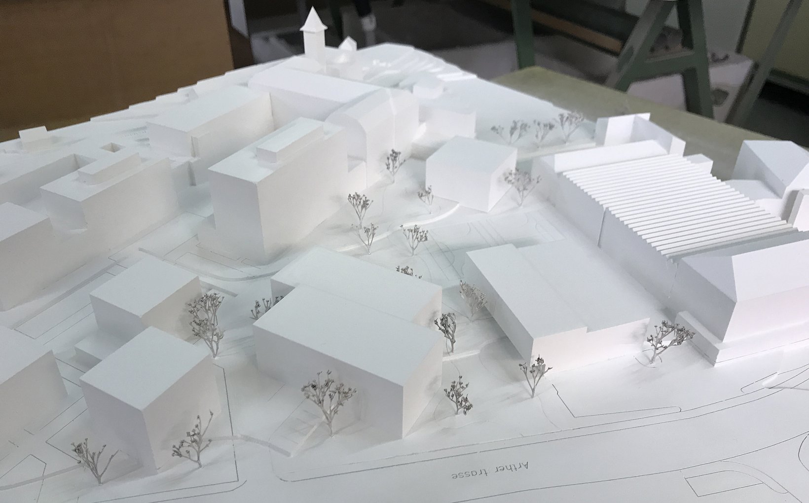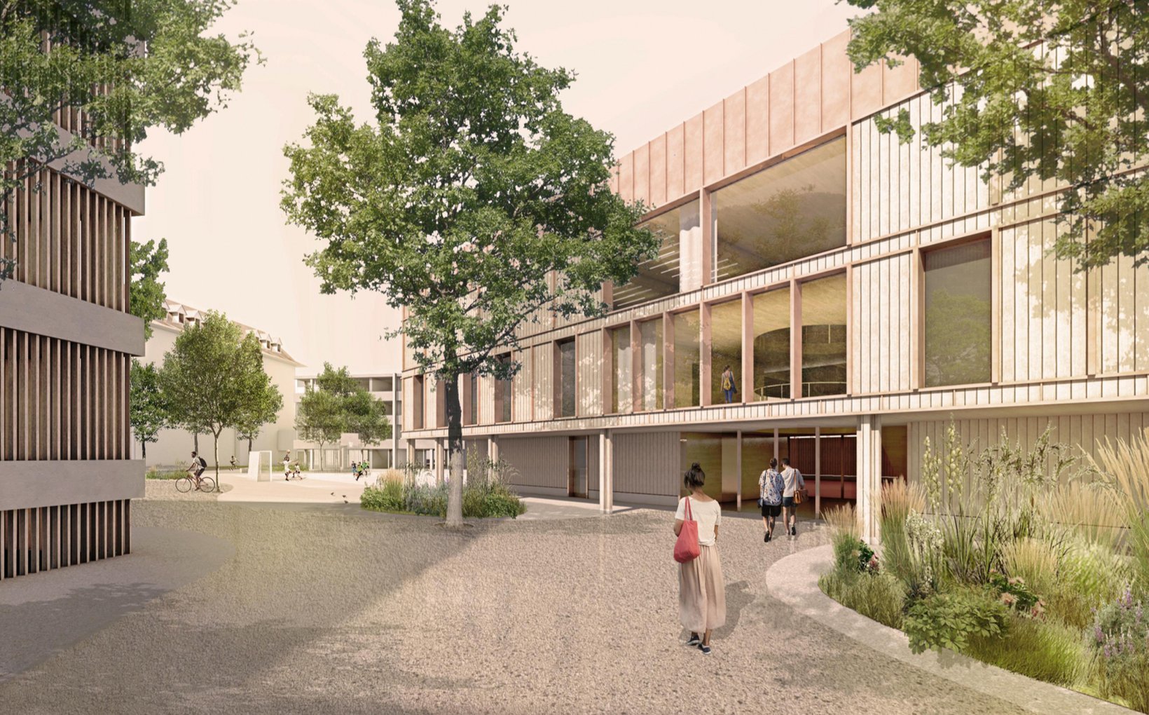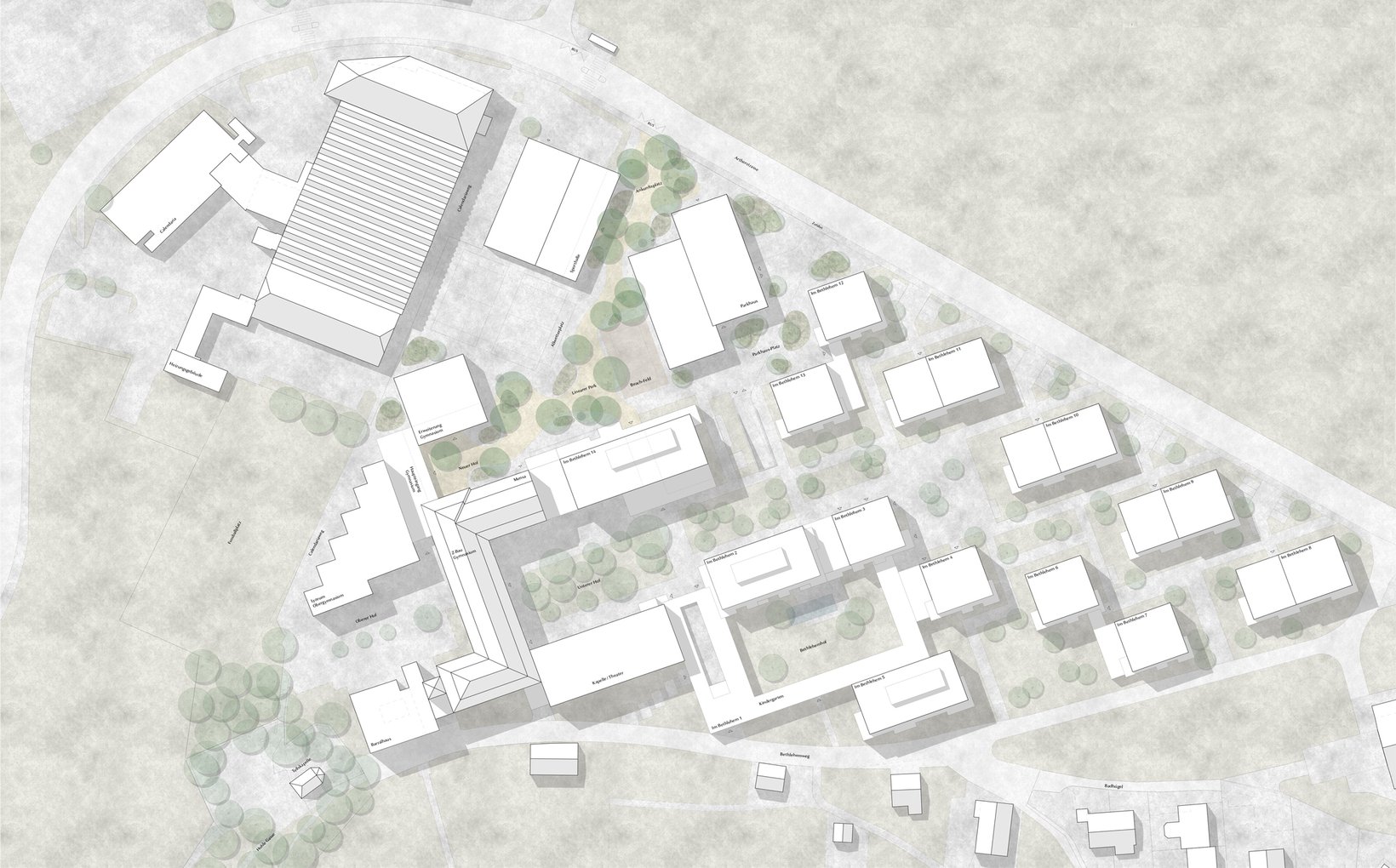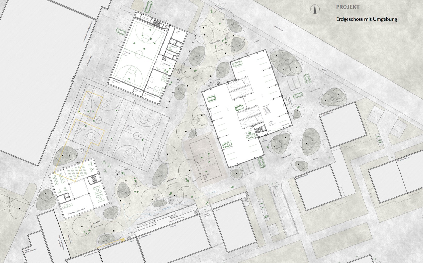 Durch ihre präzise Setzung vermitteln die neu situierten Baukörper zwischen den unterschiedlichen Ausrichtungen der Wohn- und Gewerbebauten. Sie werden zum Scharnier und spannen grosszügige und differenzierte Freiräume auf. Hier entsteht ein neuer öffentlicher Ankunftsort, welcher das Gymnasium mit der neuen Turnhalle schon von der Hauptstrasse her sichtbar macht. In der Bruchlinie der Geometrien schmiegt sich ein linearer Park mit hochstämmigen, lichten Bäumen.