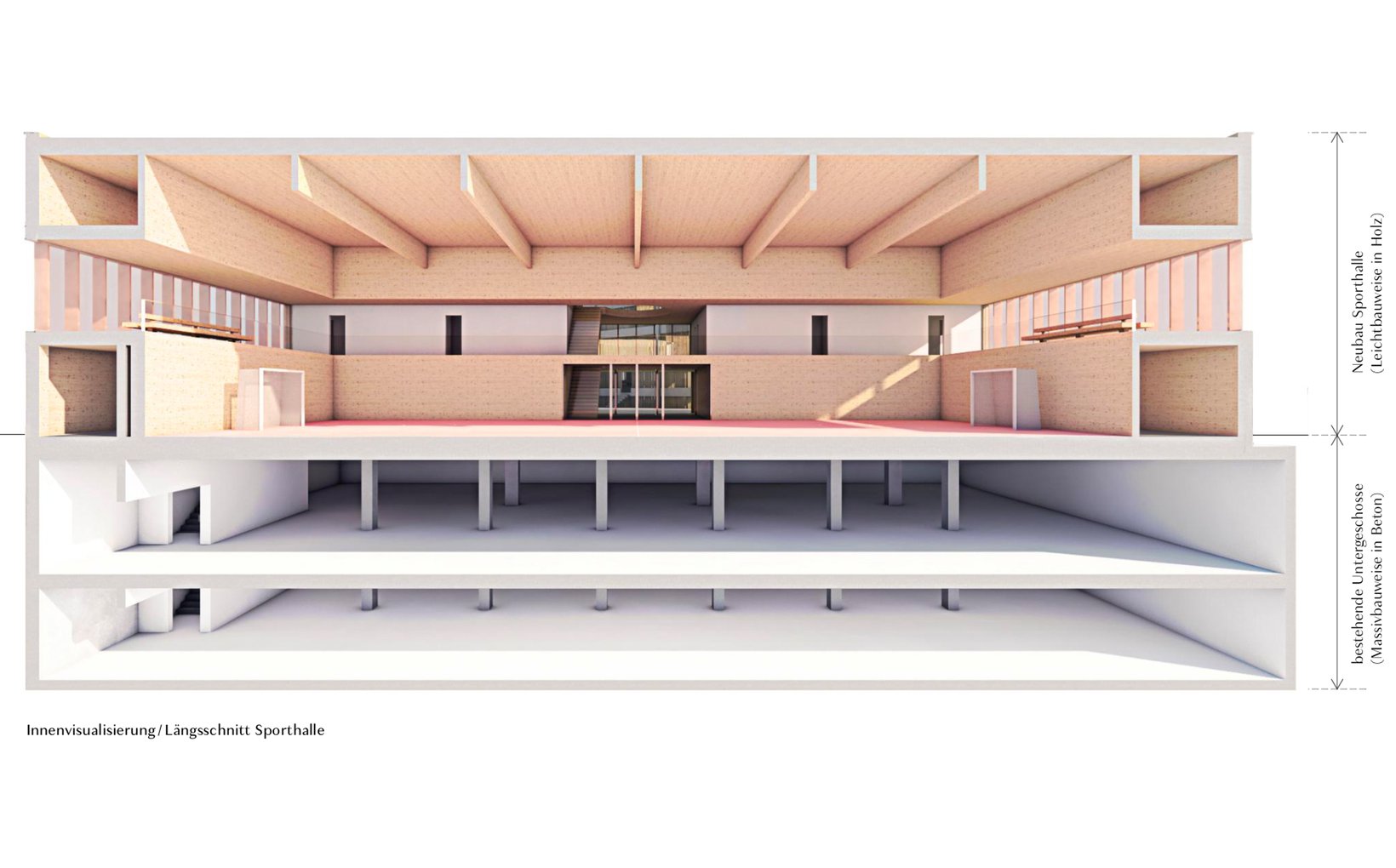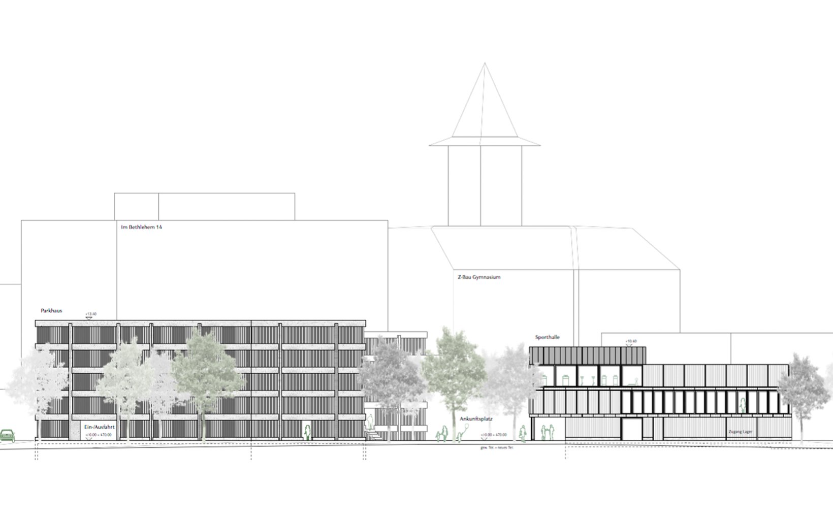 Zusammen mit der Erweiterung und den restlichen Bauten des Gymnasiums entsteht ein Ensemble, welches sich um den neuen Haupteingang des Gymnasiums formiert und diesen in im neuen Hof angemessen ins Zentrum rückt.