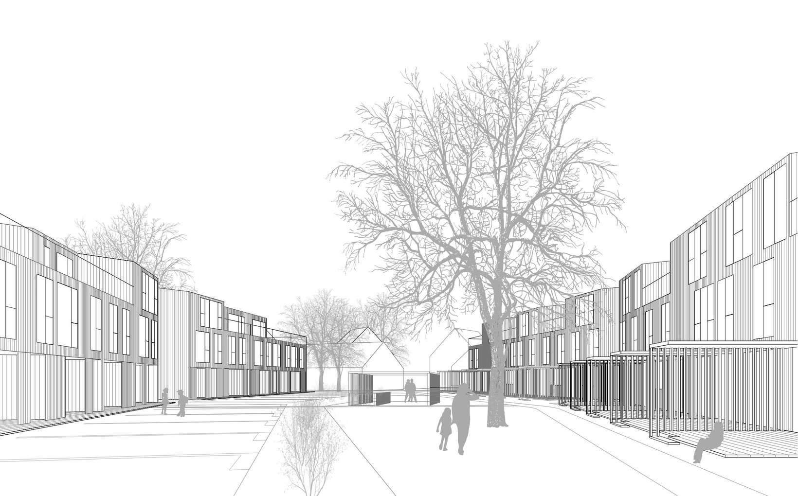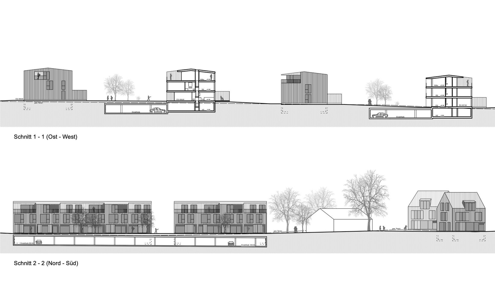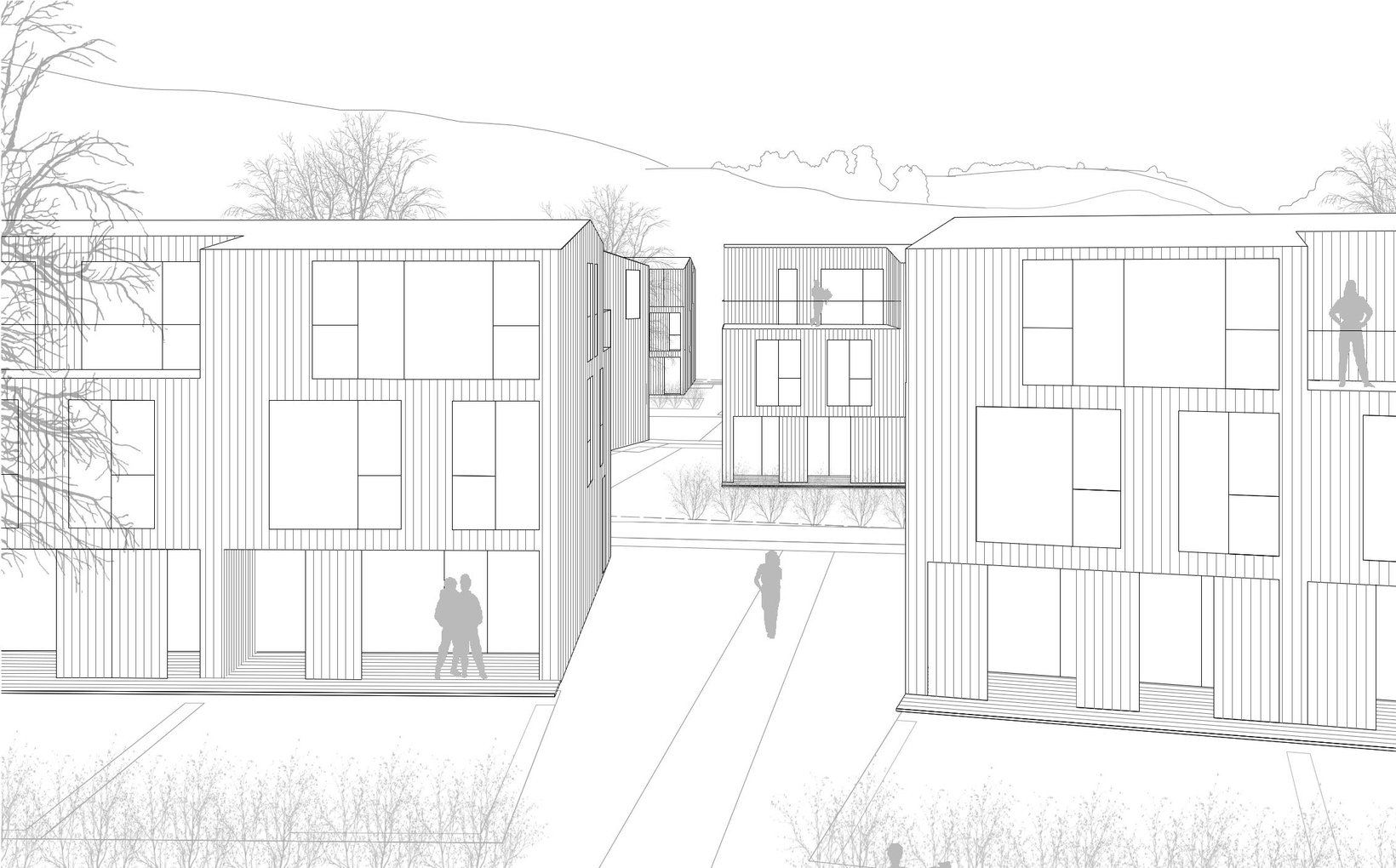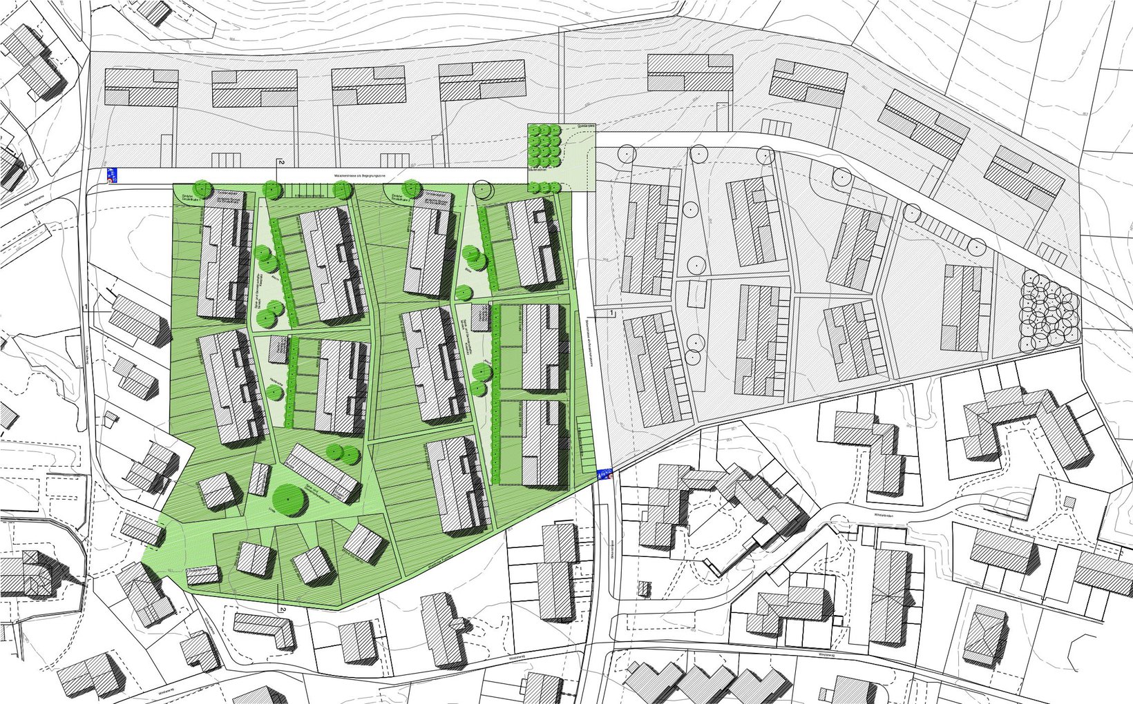 Das neue Wohnquartier artikuliert den Übergang von der Haufensiedlung des ursprünglich ruralen Dorfkernes zum ruhigen Hügelrücken und der Landschaft. Die neuen Einfamilienhäuser sind dem kleinmassstäblichen Dorfkern zugeordnet. Die neuen Reiheneinfamilien-