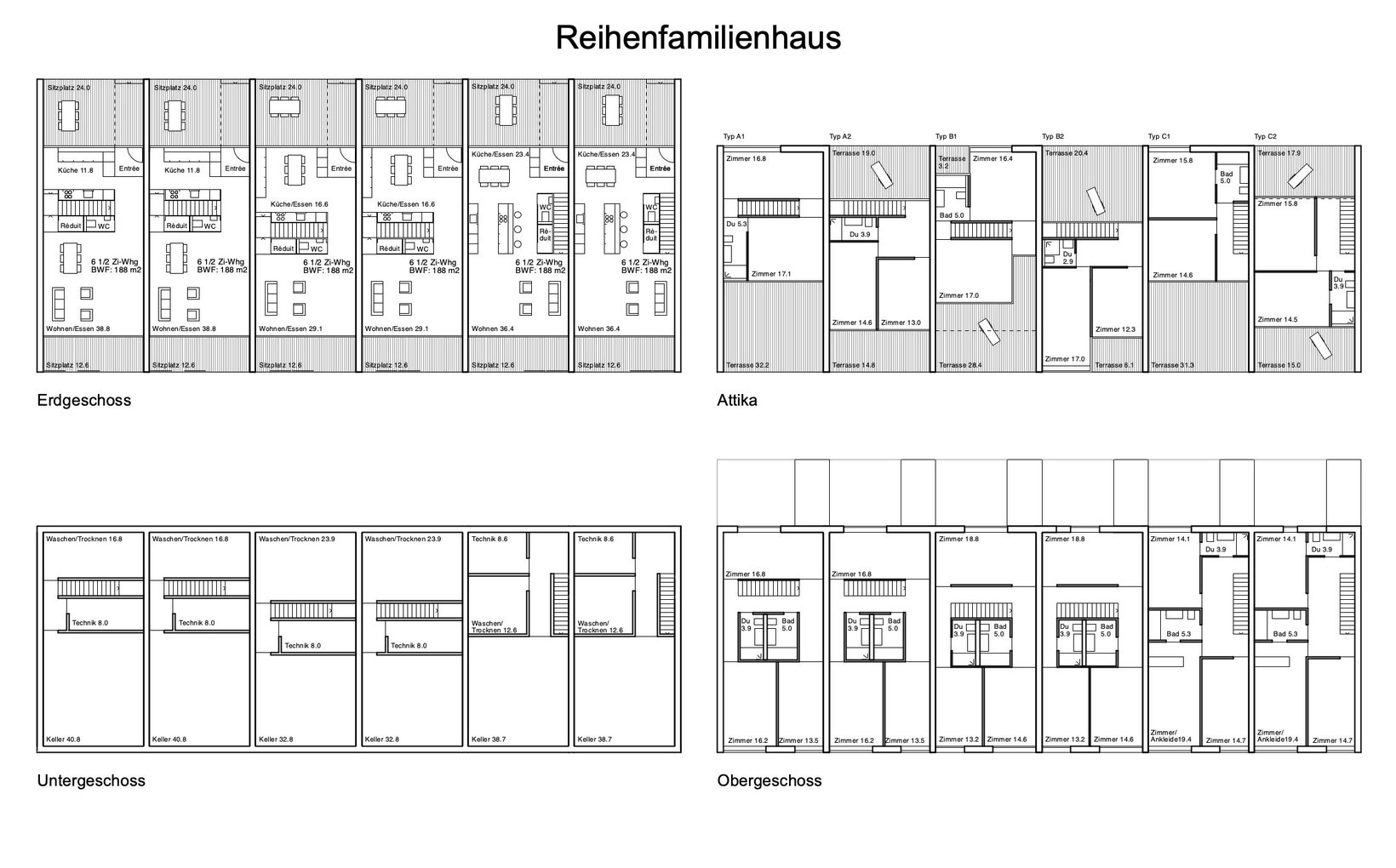 Die 54 Wohnungen bestehen aus 12 verschiedenen Grundrisstypen; 6 Reihenhaus- und 6 Geschosswohnungstypen. Das