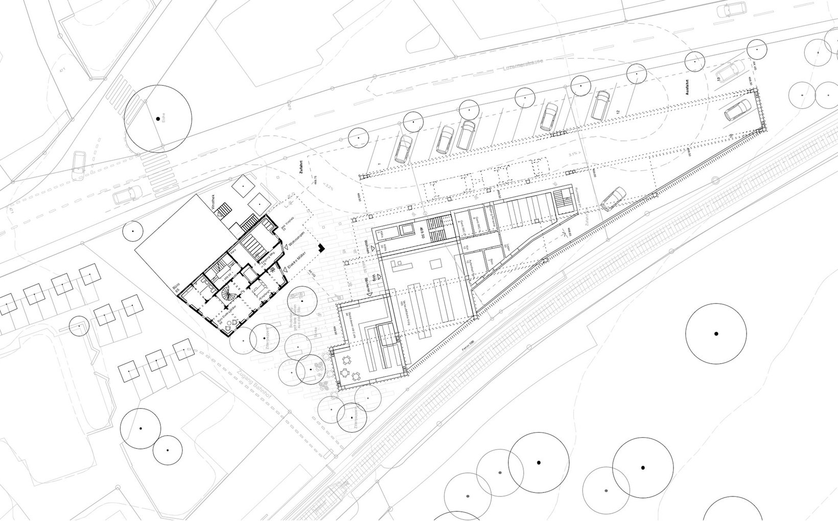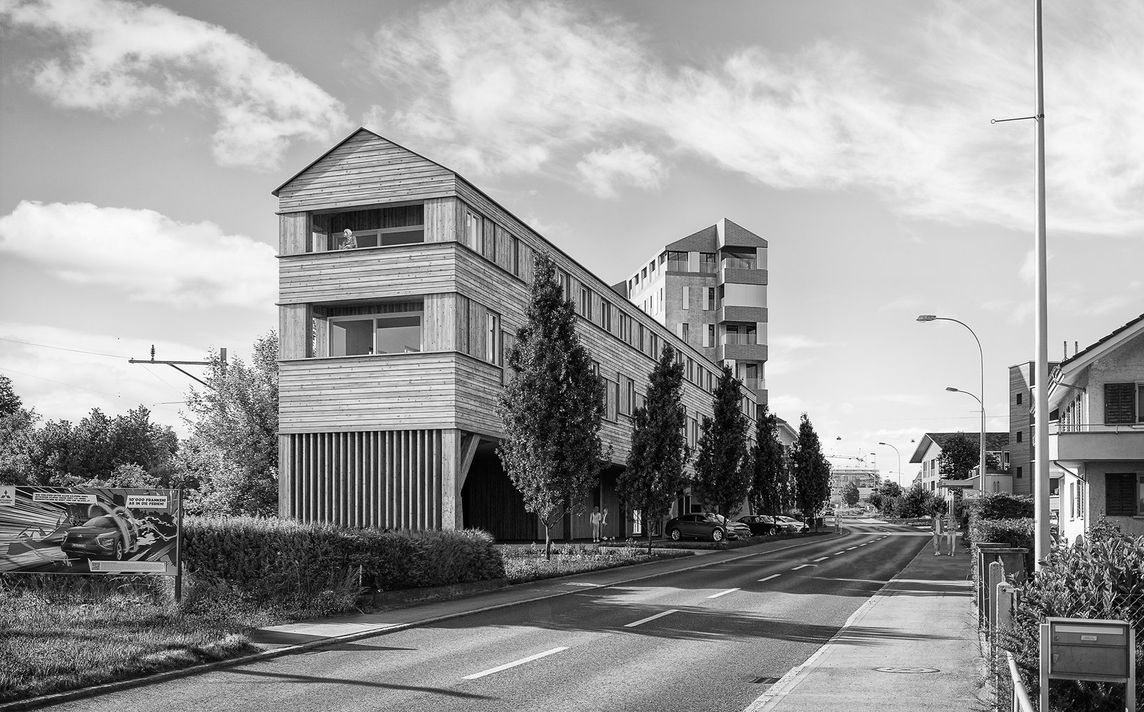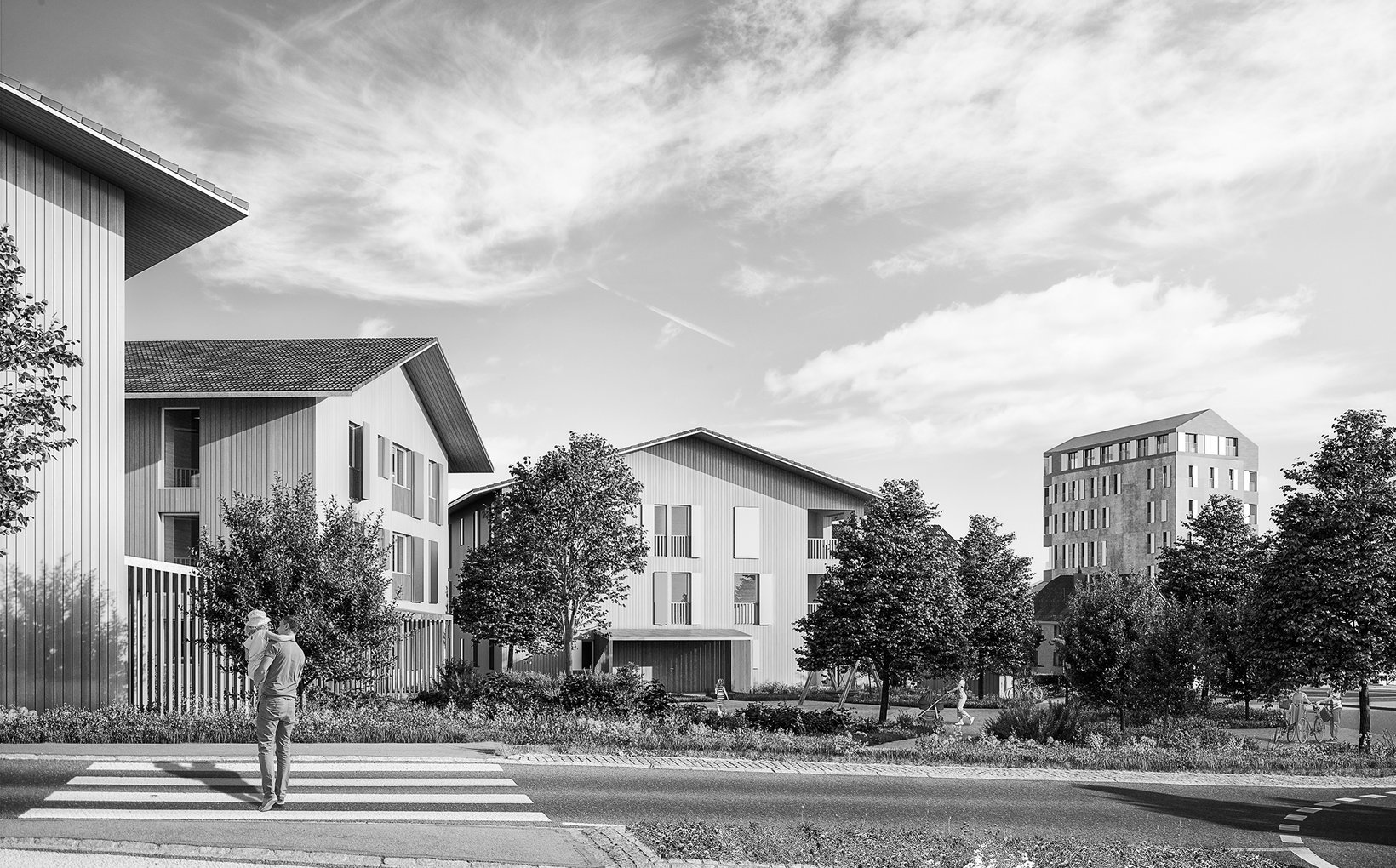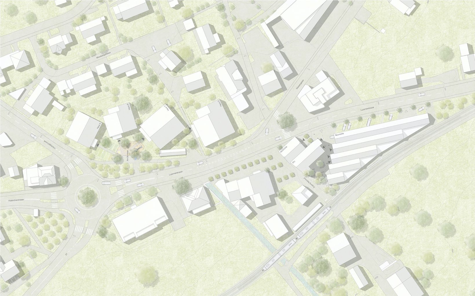 Die ehemals beschauliche Landstrasse von Gelfingen ist zur verkehrsintensiven Kantonsstrasse geworden. Kraftvoll prägt sie die angrenzenden Areale und dynamisiert sie. Gleichzeitig gibt es die Zeitzeugen der bäuerlich-dörflichen Geschichte, welche einen wichtigen Teil der Identität von Gelfingen darstellen und welche es zu erhalten gilt. Das Gebaute ist ein vielfältiges Nebeneinander im Spannungsfeld zwischen Strasse und Dorf. Mit der Entwicklung der beiden Areale „Neumühle“ und „Am Brunnen“ erscheint die Gelegenheit, dem Aufeinandertreffen dieser beiden Momente einen Ausdruck zu geben. Das Projekt zeigt Eigenheiten der unterschiedlichen Orte entlang der Strasse und bringt sie untereinander in einen fruchtbaren Dialog.